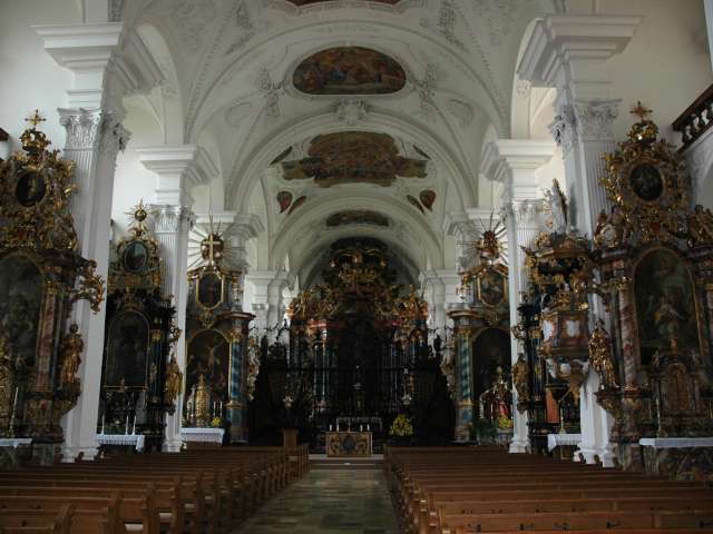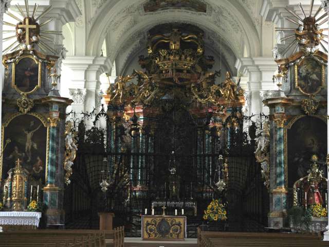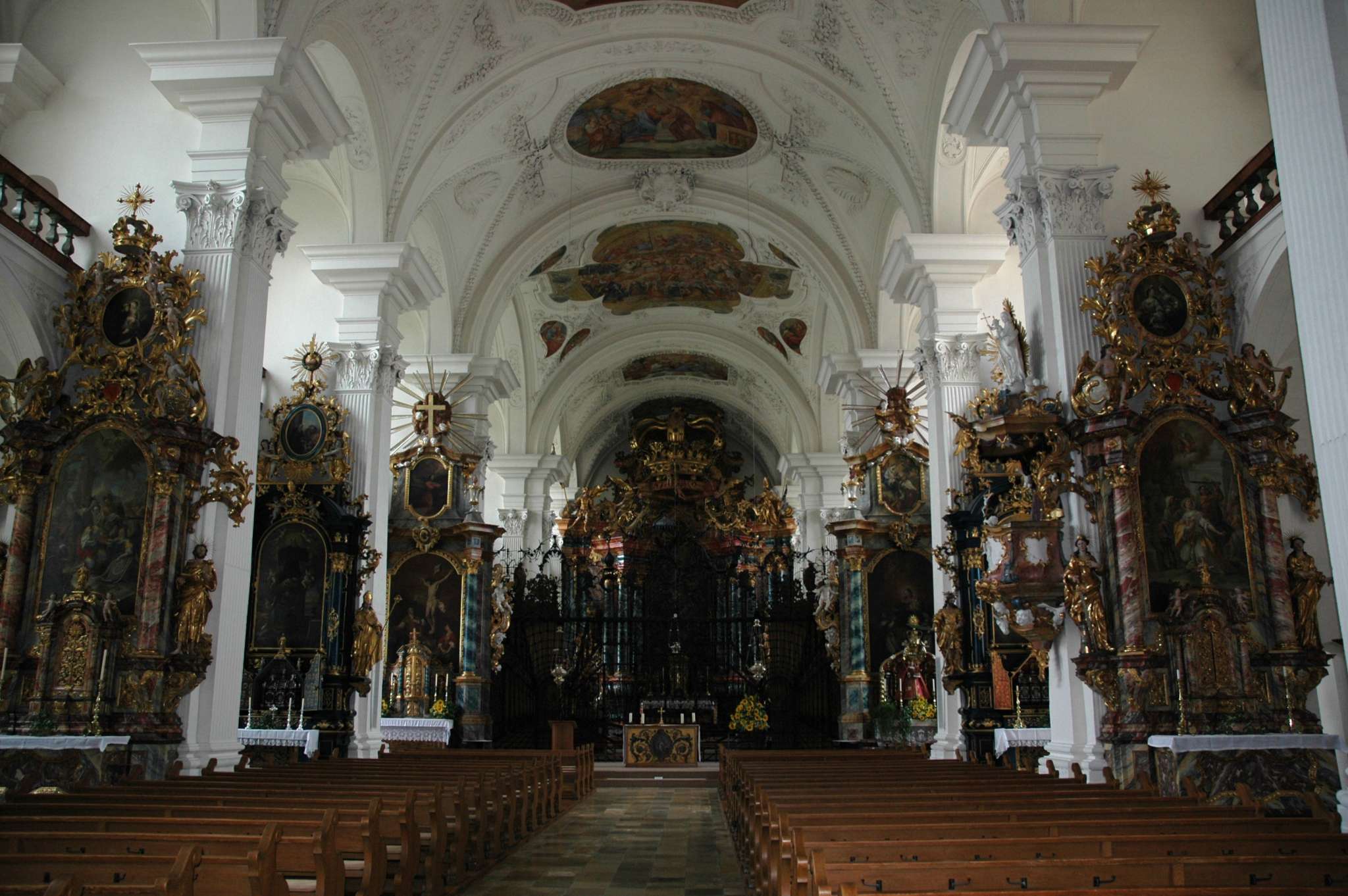 Das Hauptthema der Kirche ist Maria. Die Deckenfresken - die der Tessiner Francesco Giorgoli malte - sind immer noch in ihrer ursprünglichen Frische erhalten. Das prächtige Chorgitter wurde von den Konstanzer Schlossern Allweiler und Scheuermann errichtet.