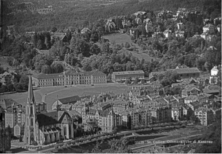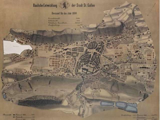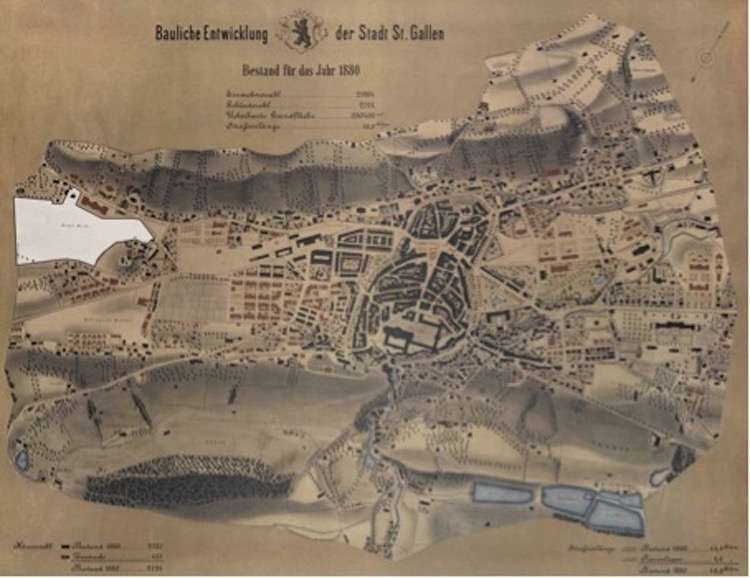 Im 19. Jahrhundert setzte eine hektische Bautätigkeit ein. Es entstanden Wohn- und Geschäftsbauten, Schulen und Kirchen, ein Stadttheater, und Tiefbauten für die Erschliessung der neu angelegten Quartiere. Die Anbindung St.Gallens an das Schweizer Eisenbahnnetz im Jahr 1856 führte zu einem zusätzlichen Bauboom. All dies veränderte das Stadtbild nachhaltig: Der bisherige Siedlungsraum – die Altstadt und die Vorstädte - bot mit der Zeit zu wenig Platz, so dass bis zum Ende des 19. Jahrhunderts zunächst der ganze Talboden zwischen Kreuzbleiche und St.Fiden, und danach auch Teile der Hänge im Norden und Süden der Stadt überbaut wurden.