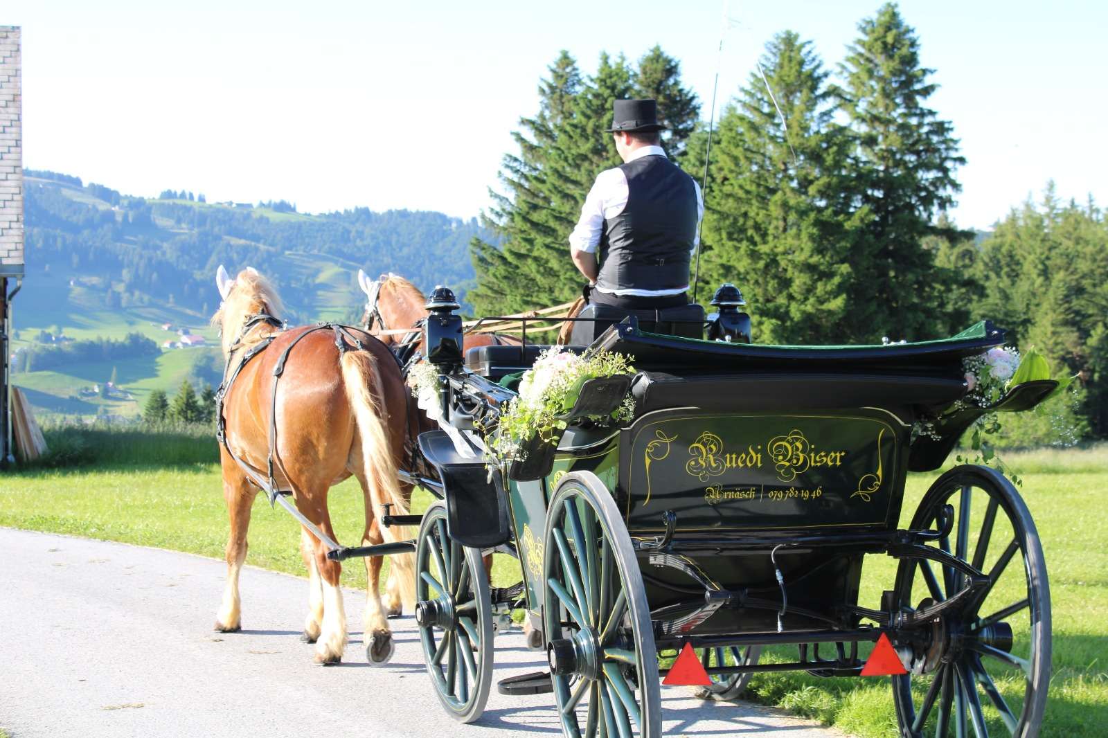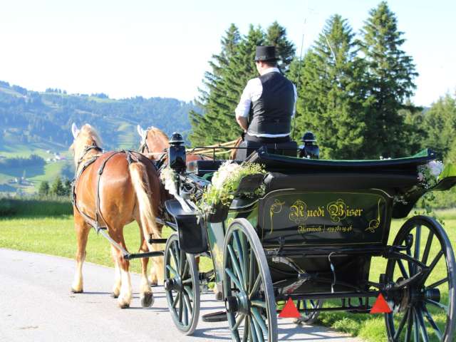 Als gelernter Hufschmied und Landwirt bietet Ruedi Biser interessante, beruhigende und abwechslungsreiche Ausfahrten mit seine Pferden an. Es stehen verschiedene Kutschen, passend zu jedem Anlass, zur Verfügung: