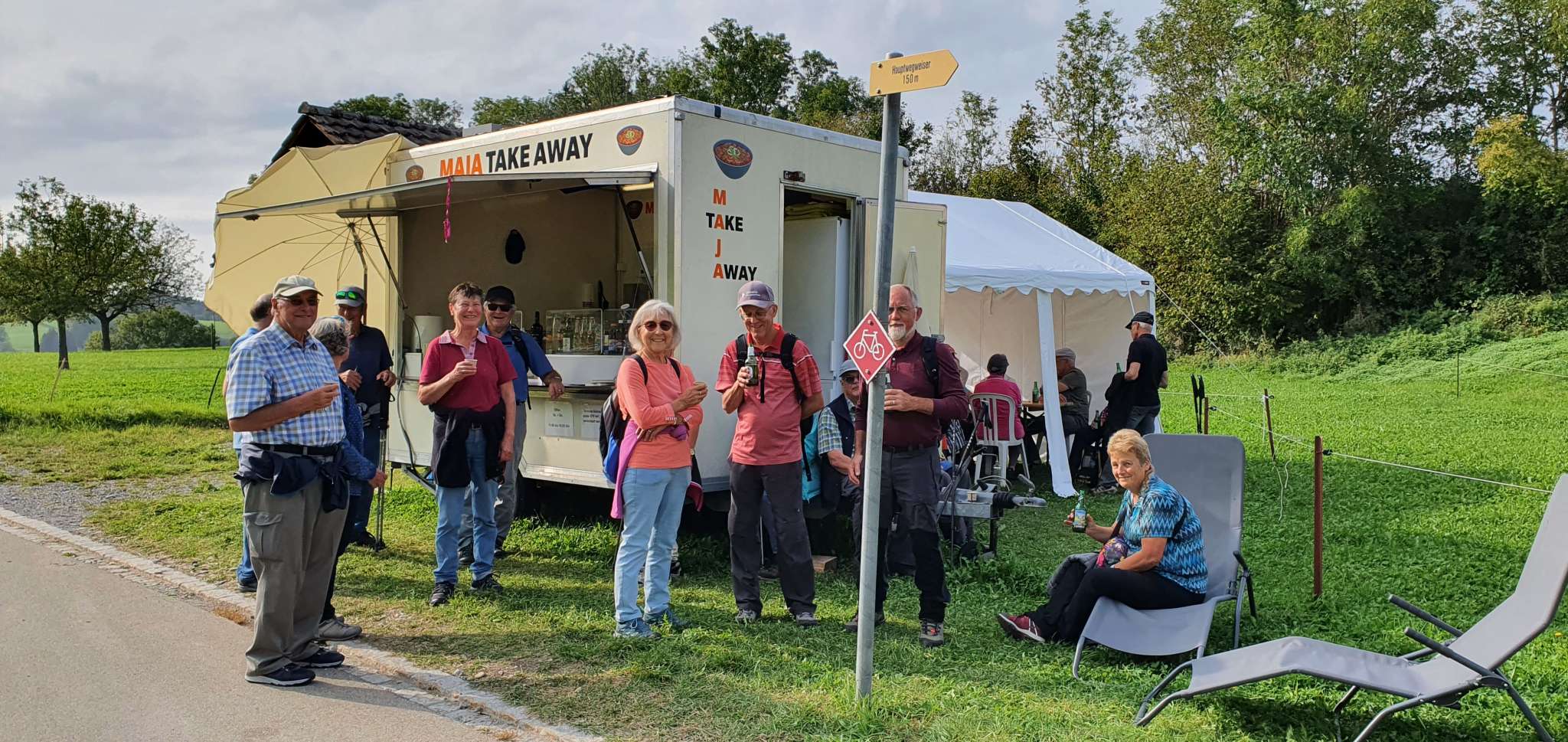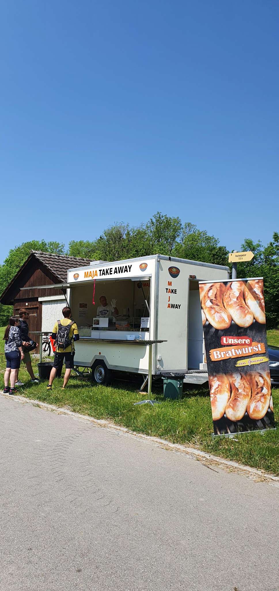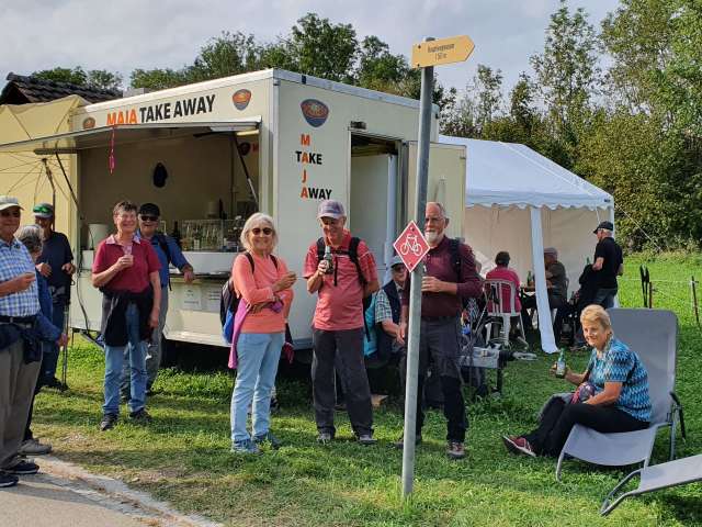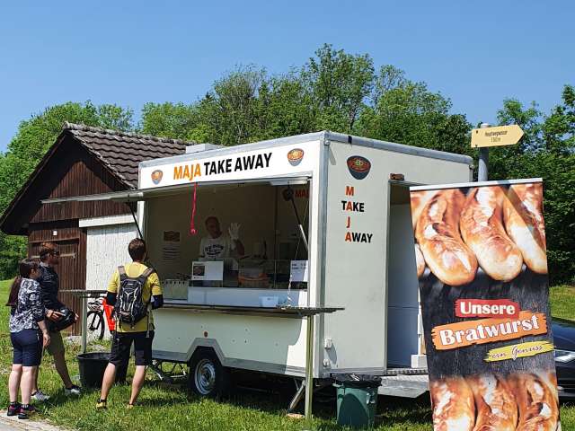 Hungrige und Durstige verköstigt Maja Maier beim Take-away-Stand auf dem Chistenpass im Wolfhäldliger Weiler Sonder. Im Angebot sind erfrischende Getränke, selbst gemachter Kartoffelsalat, Schnitzelbrot, Pommes frites und Würste vom Grill - eine ideale Stärkung, um den zweiten Teil des Witzwegs in Angriff zu nehmen.