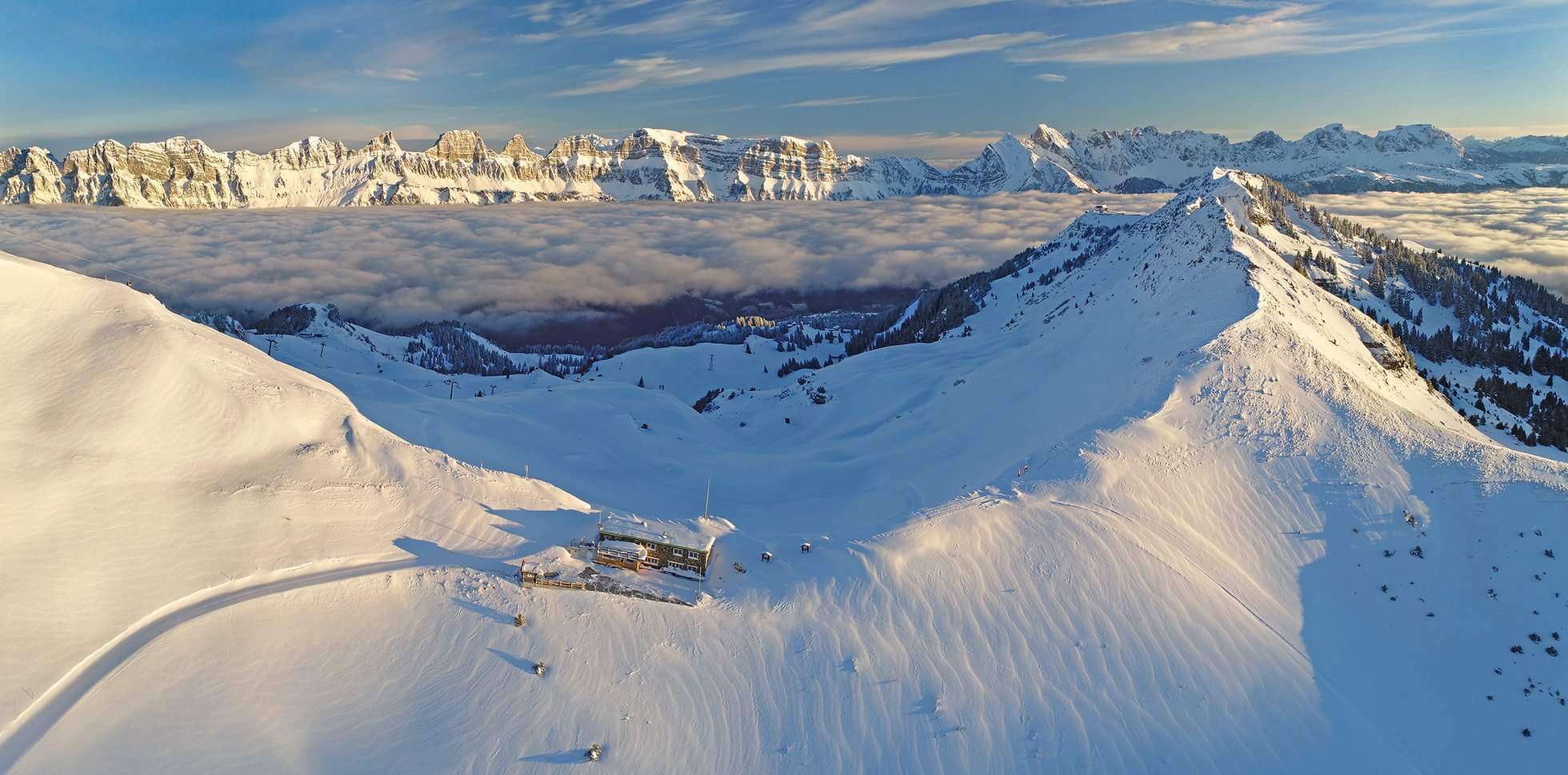 Geniessen Sie im Winter wunderschöne Ausblicke auf das verschneite Panorama von Ringelspitz über Piz Sardona bis Spitzmeilen und Magerrain.