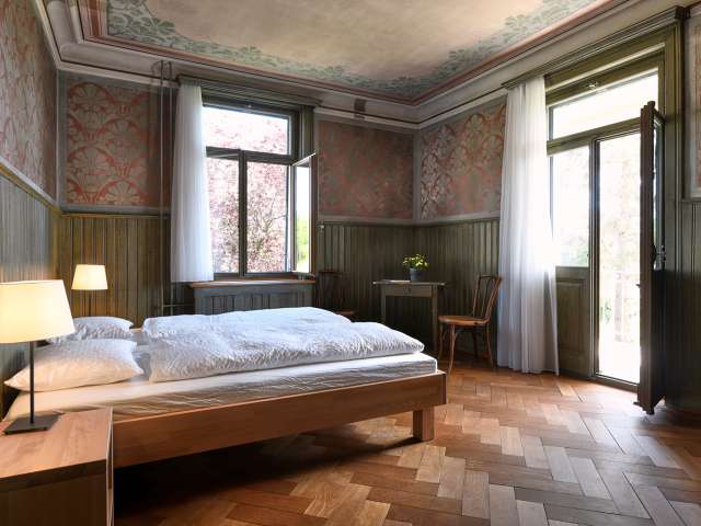 Das Max Burkhardt Haus bietet in der 2-Zimmer-Wohnung im ersten Obergeschoss Platz für 2 Personen. Ein grosser Balkon mit Blick in den Garten gehört ebenfalls zur Wohnung.