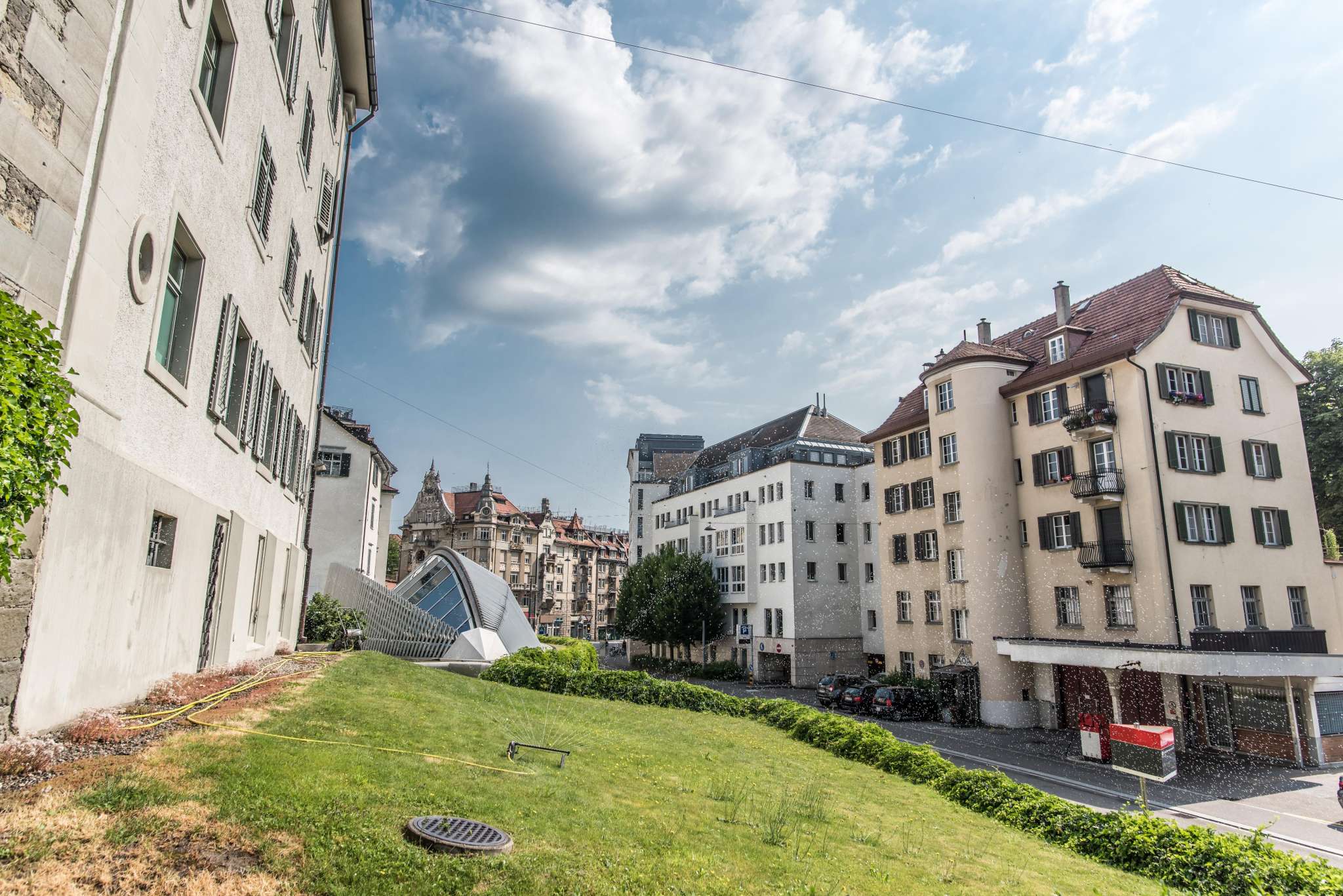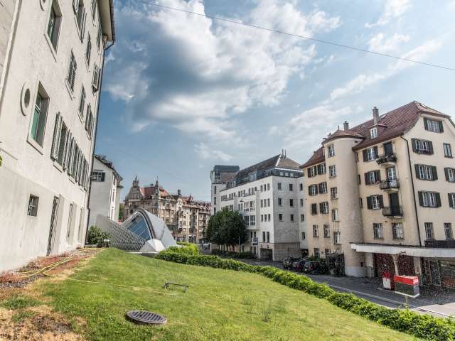 Der Pavillon im Klosterbezirk wurde vom Architekten Santiago Calatrava entworfen. Er beherbergte die Kantonale Notrufzentrale. Auffällig ist das elliptisch aufgeworfene Glasdach.