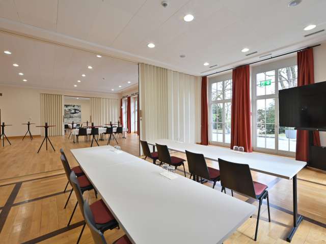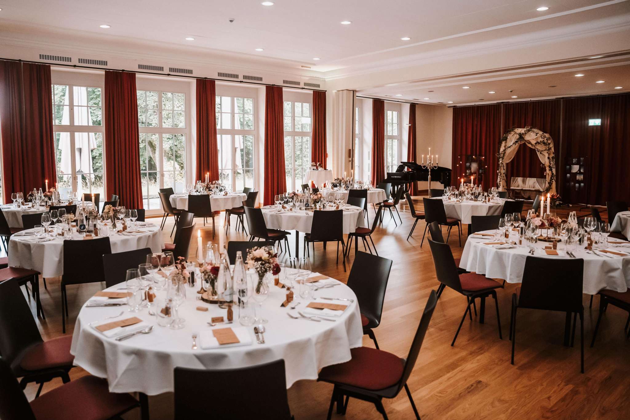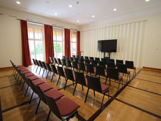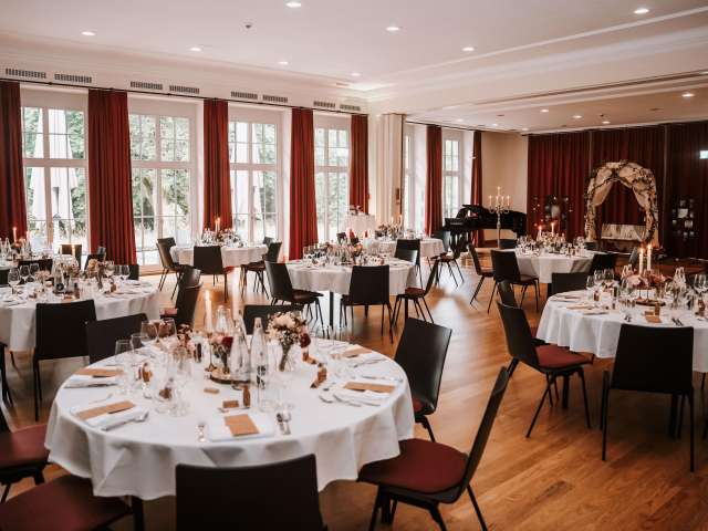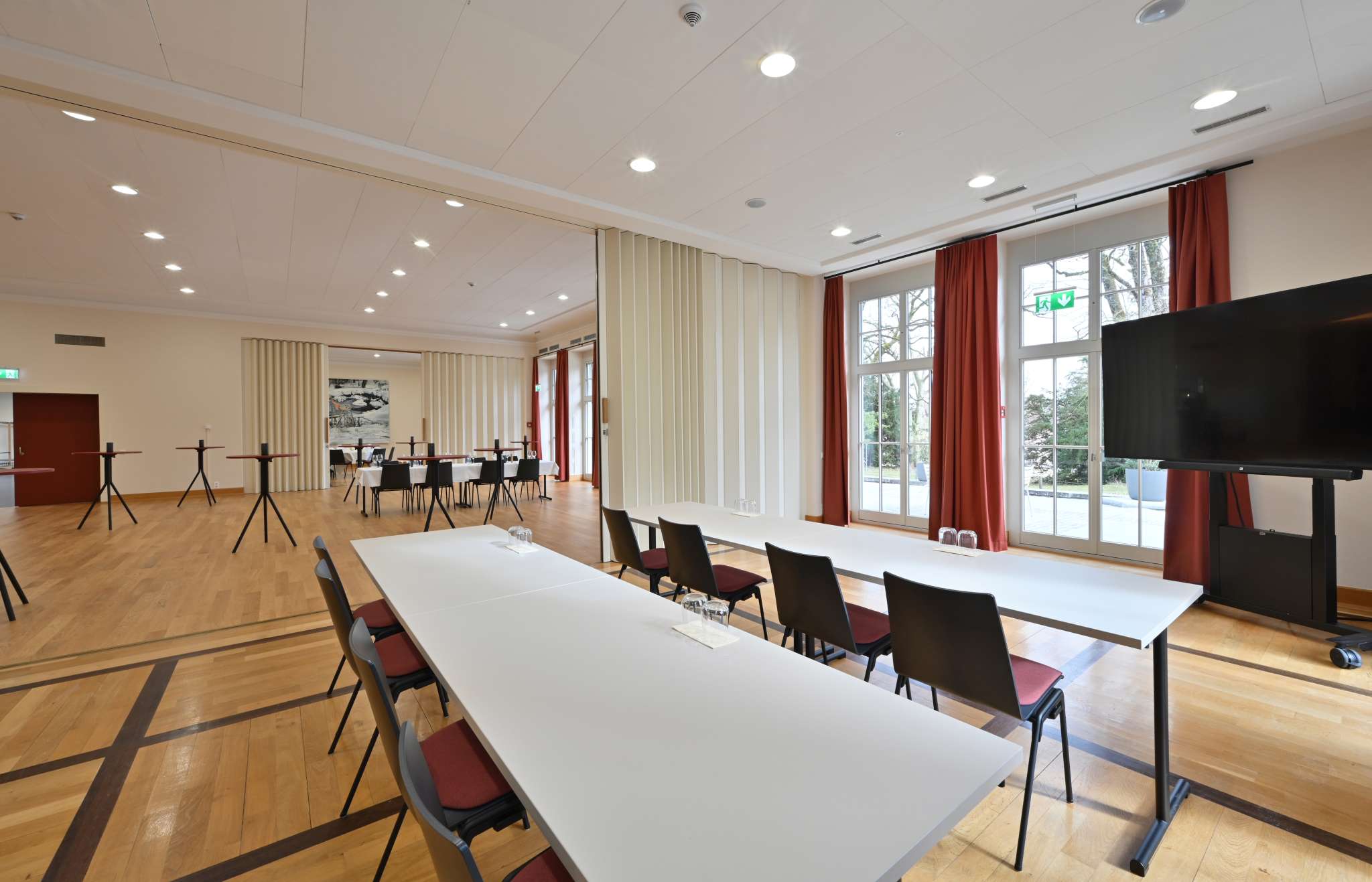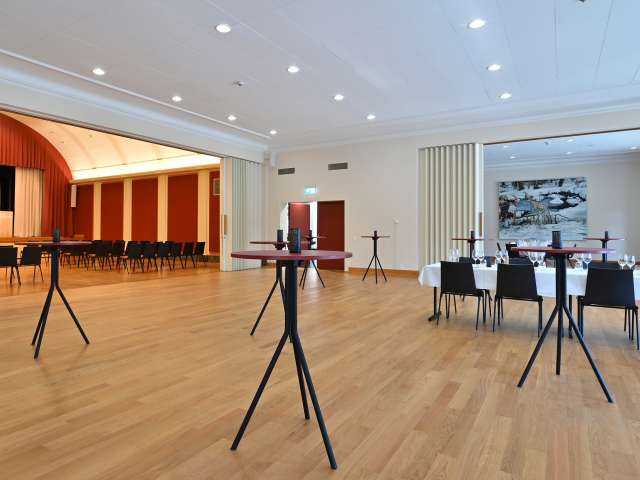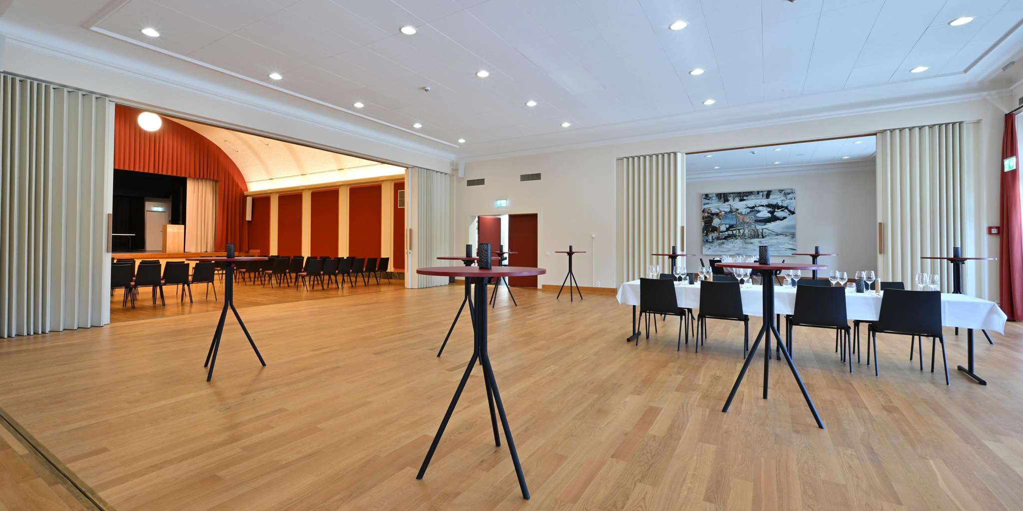Feiern, Tagen und Begegnen. Die Eventlocation mit einem flexiblen Raumkonzept mit 4 Sälen, Bühne, Foyer, Terrasse und grossem Garten bietet das ideale Ambiente für Veranstaltungen aller Art und Grössen. 30 bis 350 Personen finden auf über 600 m2 Raumfläche Platz. Für die Generalversammlung, das Business-Meeting, die Kunstausstellung, die Diplomfeier oder die Hochzeitsfeier. Dank der umfassenden Renovierung trifft hier historischer Charme auf moderne Event-Infrastruktur. Neueste Technik, Klimaanlage und zeitgemässes Mobiliar. Zu jedem Anlass wird das passende kulinarische Angebot unterbreitet, von kleinen Häppchen bis hin zum mehrgängigen Gala-Dinner.