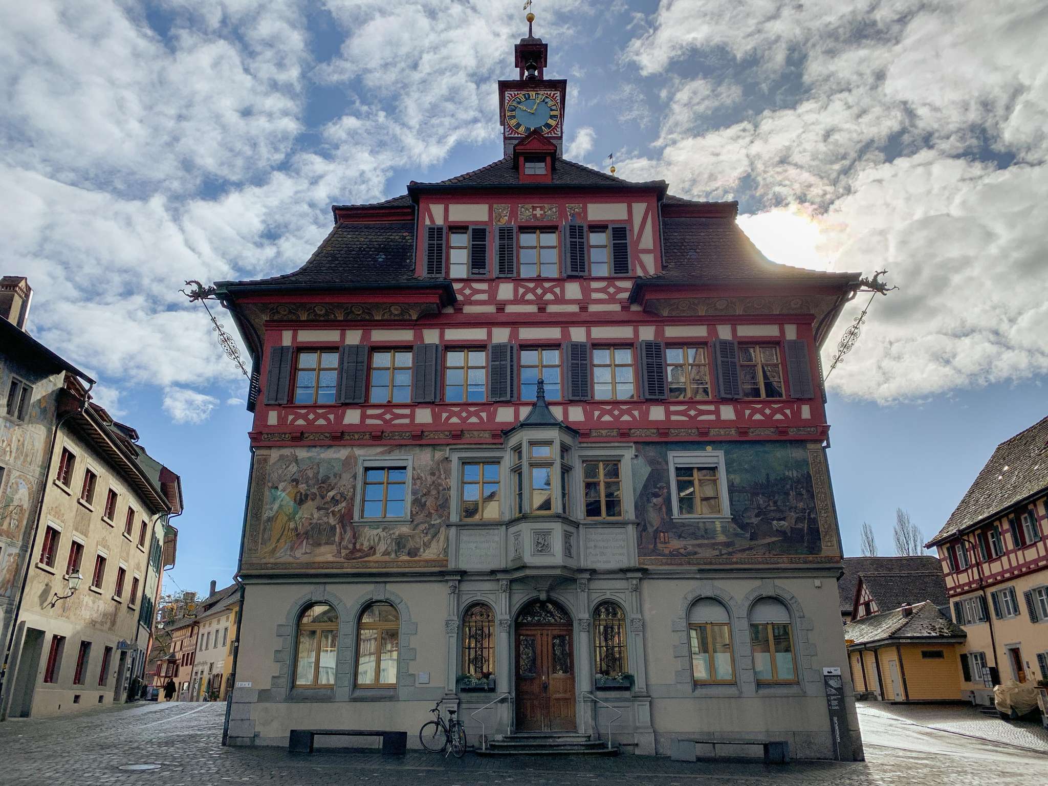 Das Rathaus entstand in den Jahren 1539 bis 1542. Lange Zeit diente es auch als Tuch-, Korn- und Kaufhaus. Seine heutige Gestalt erhielt es zwischen 1898 und 1900. Damals wurden die Markthalle geschlossen sowie der Erker und die Malereien angebracht. Die Geschichtsbilder stammen vom Historienmaler Carl von Häberlin aus Stuttgart, die Wappen und Figuren von Christian Schmidt aus Zürich. Im gotischen Grossen Ratssaal befinden sich unter anderem die berühmte Wappenscheibenkollektion von 1542 und eine Waffensammlung aus dem 15. bis 18. Jahrhundert. Im Kleinen Ratssaal, der 1766 mit vergoldeter Täfelung im Rokoko-Stil ausgestattet wurde, tagt seit 1542 der Stadtrat.