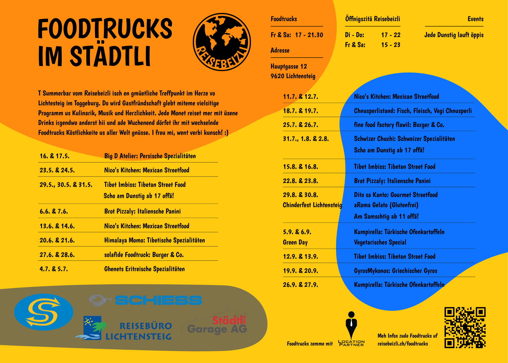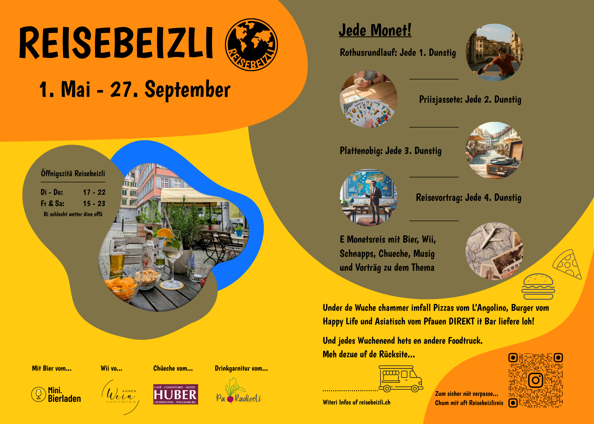 Sommerbar mit Drinks und Bier aus aller Welt. Foodtrucks an den Wochenenden. Events jeden Donnerstag. Rothusrundlauf, Priisjassete, Plattenabend, Reisevorträge.