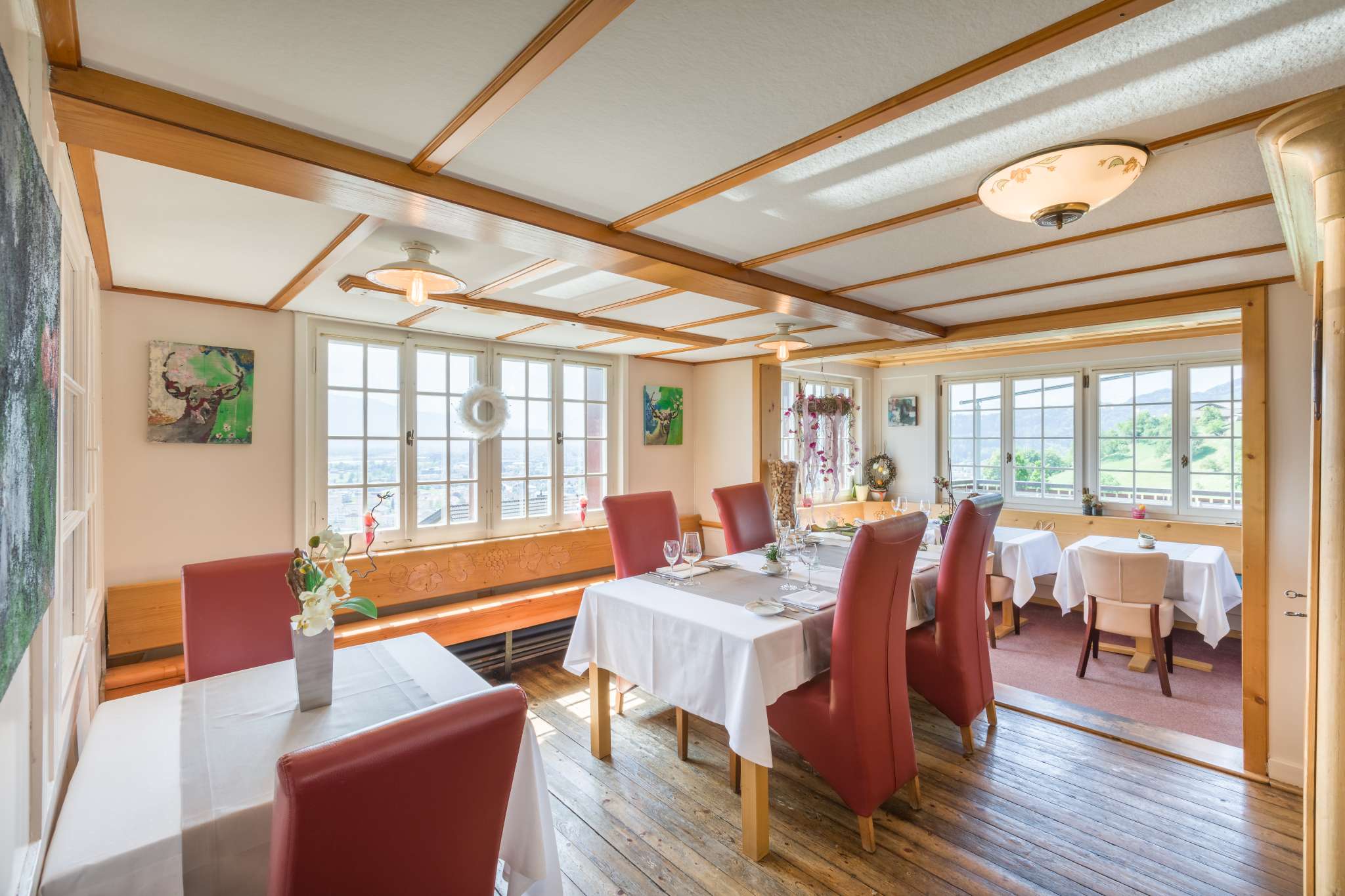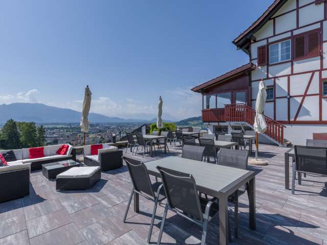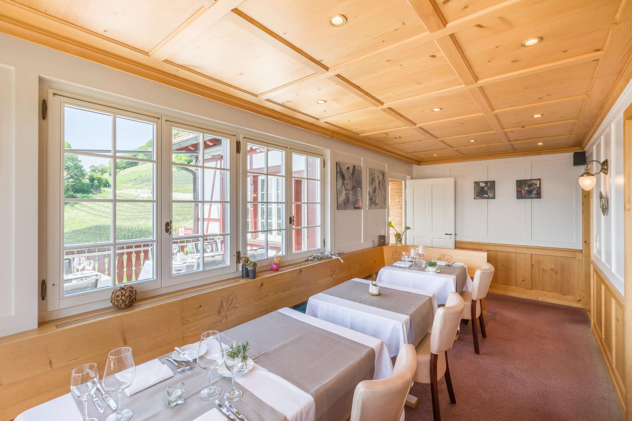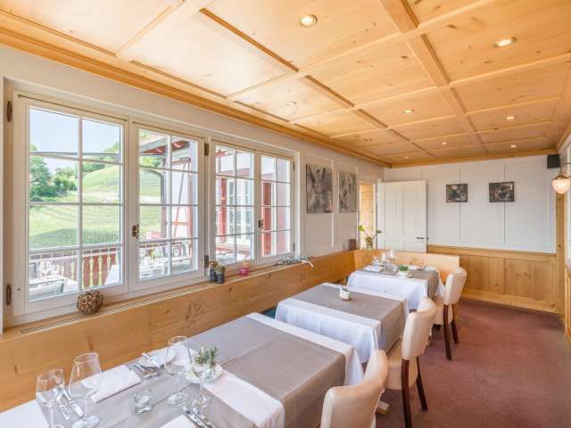 Umgeben von traumhaften Reben lädt das besondere Ambiente, welches Modernes und Historisches miteinander verbindet im Restaurant Burg in Au zum Verweilen für gemütliche Stunden ein.