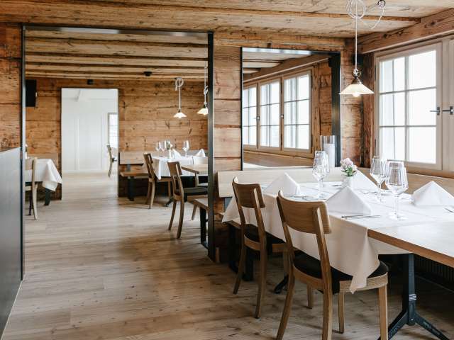 Die sorgfältig restaurierte Gaststube aus dem Jahr 1582 bietet eine stimmige Kulisse aus alt und neu. Im Saal können bis zu 80 Personen das charmante und liebevoll gestaltete Ambiente des Landhauses geniessen. Die Küche ist saisonal, regional und modern - authentisch, frisch und von konstanter Qualität.