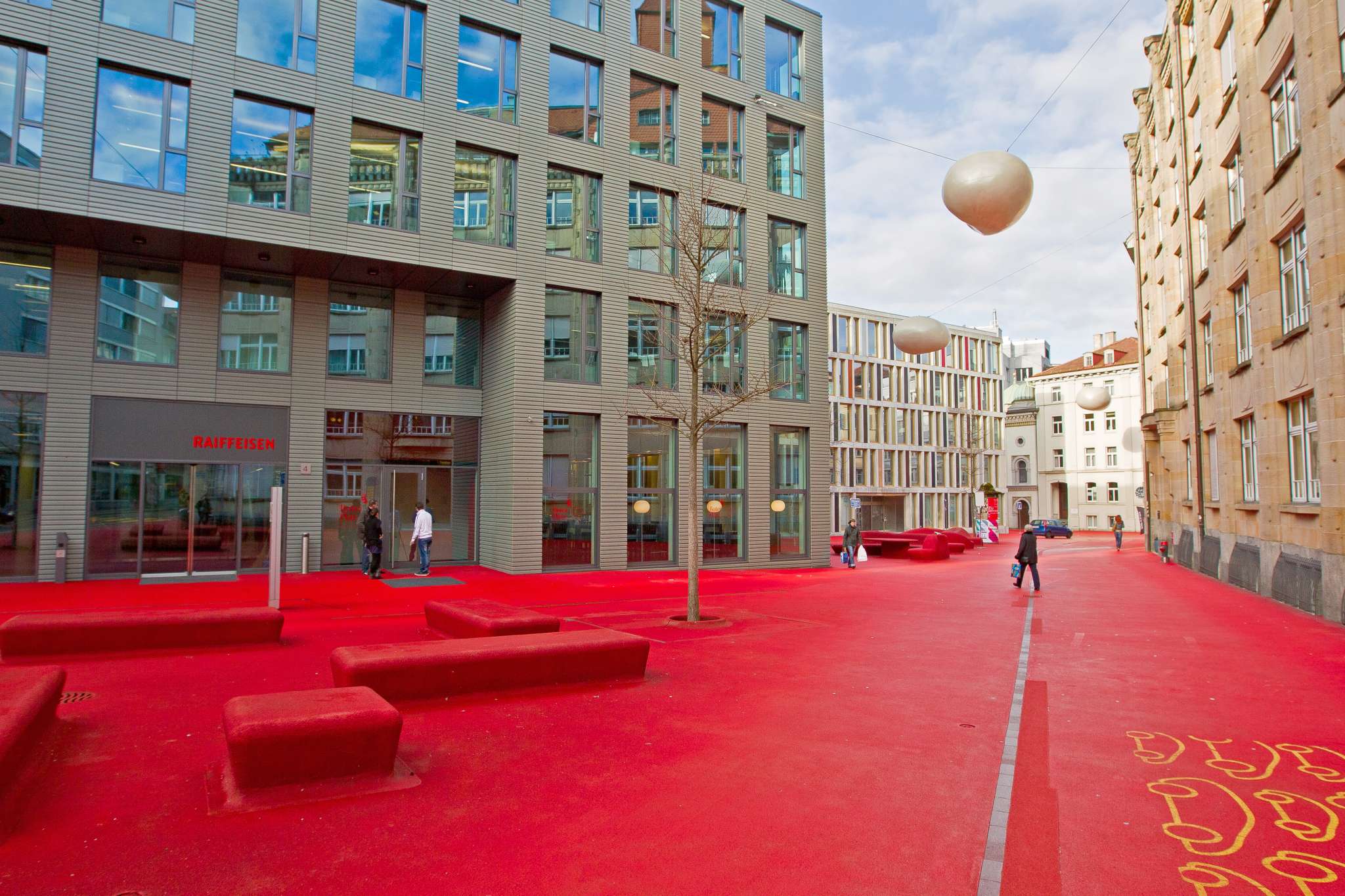 Der grosse Rote Platz ist mit Sofas, Stühlen, Tischen, Liegen und einem Porsche möbliert und wurde von der Künstlerin Pipilotti Rist zusammen mit dem Architekten Carlos Martinez entworfen. Der Platz wird auch «Stadtlounge» genannt und ist mit einem knallig roten Teppich aus Kunststoffgranulat überzogen.