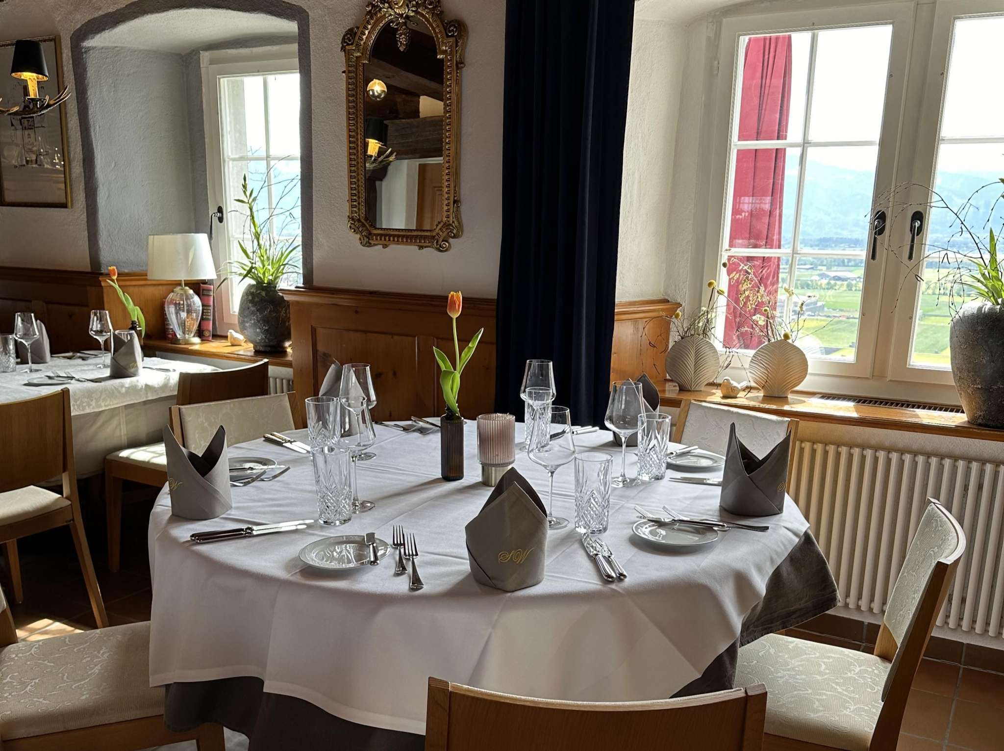 Auf Schloss Weinstein geniessen Gäste gutbürgerliche, saisonale Küche in historischem Ambiente – ergänzt durch eine einmalige Aussicht und den passenden Rahmen für Hochzeiten und Veranstaltungen.