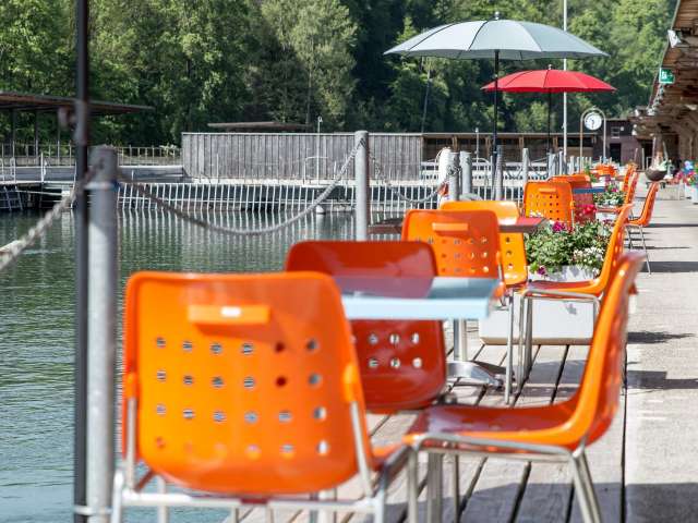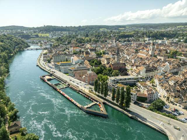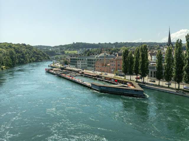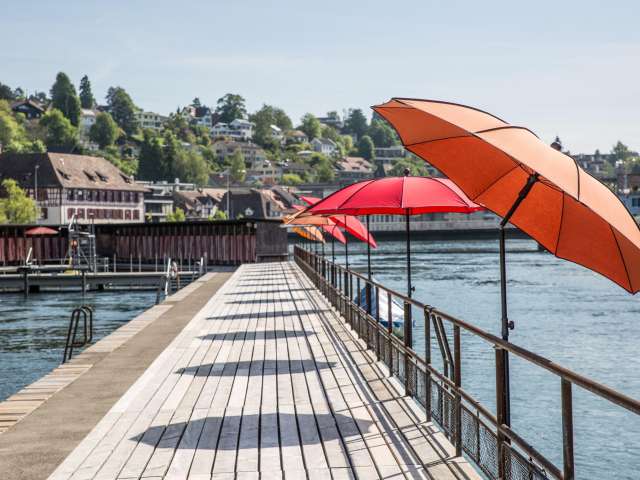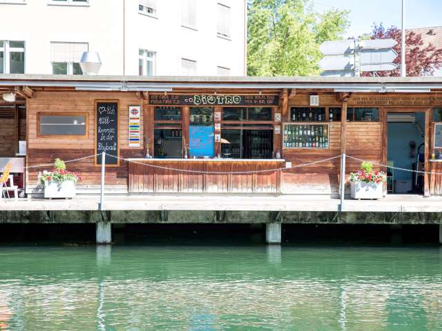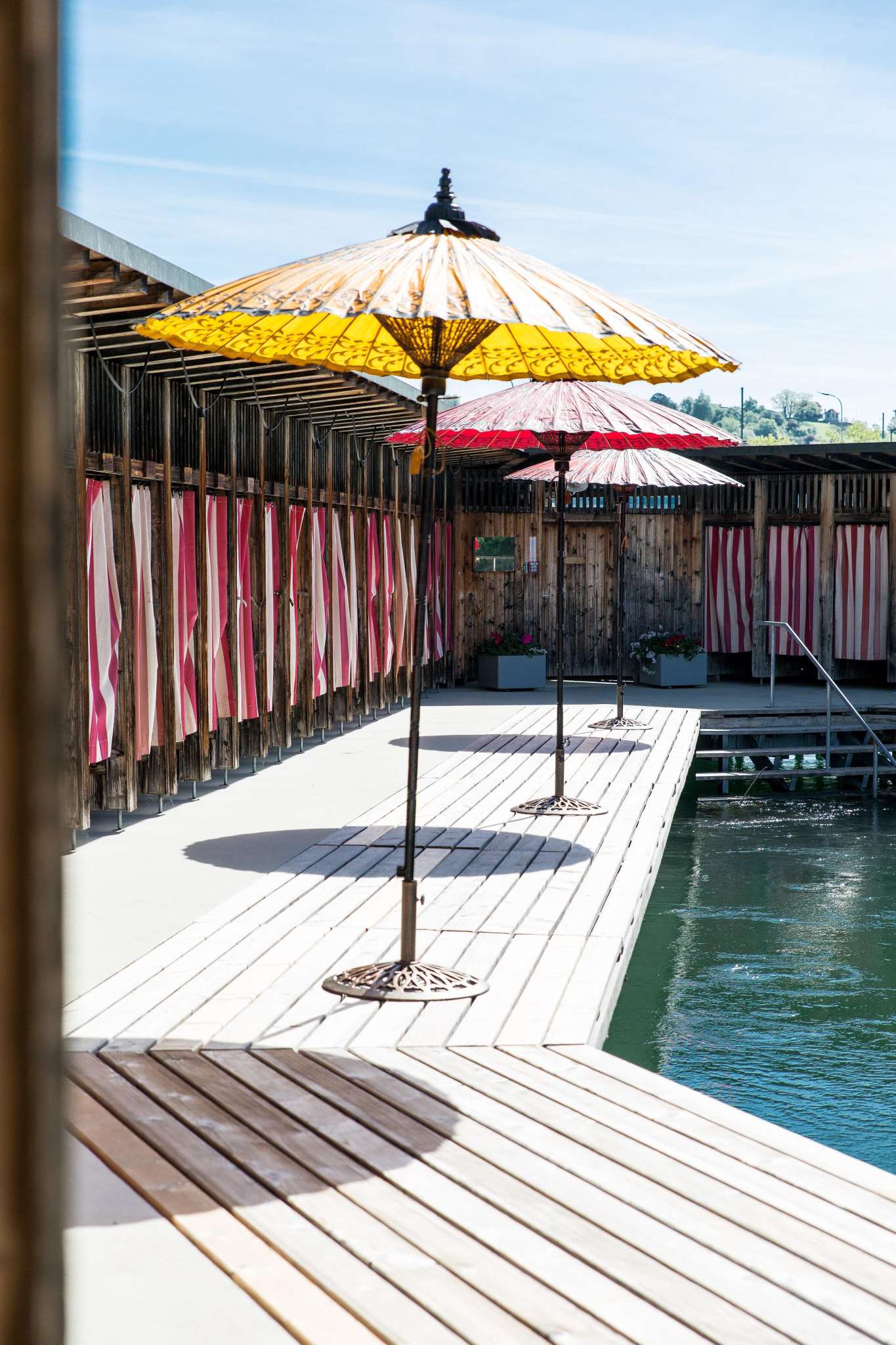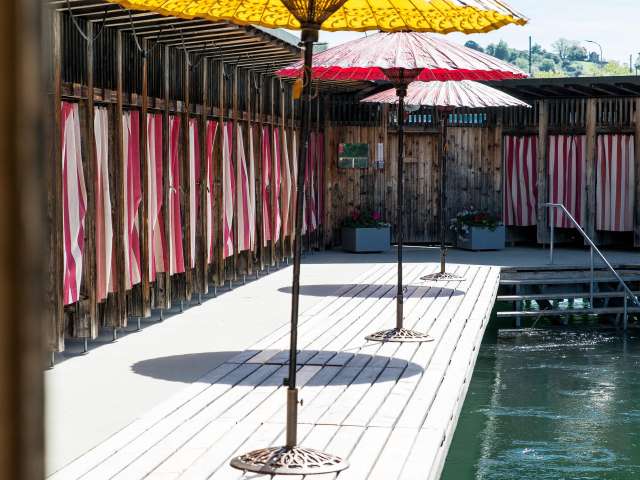 Abschalten vom Alltag und der Seele Gutes tun. Sonnenschein, kühles Nass, spritzige Getränke und Gaumenfreuden. Energie tanken und gemütliche Abendstunden in ausgelassener Stimmung geniessen. Saisonale, regionale Mittagsmenüs, täglich frisch. Geschichte Seit 1870 stellt das grosse Schaffhauser Holzbad seinen Bug in die Rheinströmung unter dem Munot. Verantwortlich für den Bau des grössten noch erhaltenen Kastenbades der Schweiz (es soll gar die älteste Flussbadeanstalt Europas sein) war Stadtbaumeister Johann Gottfried Meyer. Durch die Stauung des Kraftwerkes ist der Pegelstand im Bad konstant. Schwimmer sollten jedoch beachten, dass die Strömung des Rheins bei grösserer Wassermenge schneller wird.