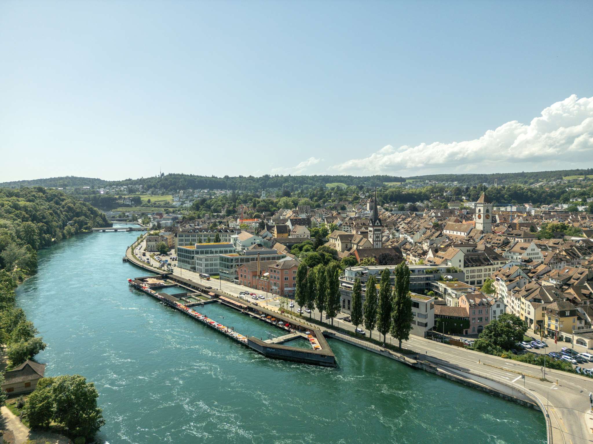 Historisches Flussbad mit Sprungbretter ca. 1 und 3 m hoch und verschiedenen Becken im Rheinwasser.