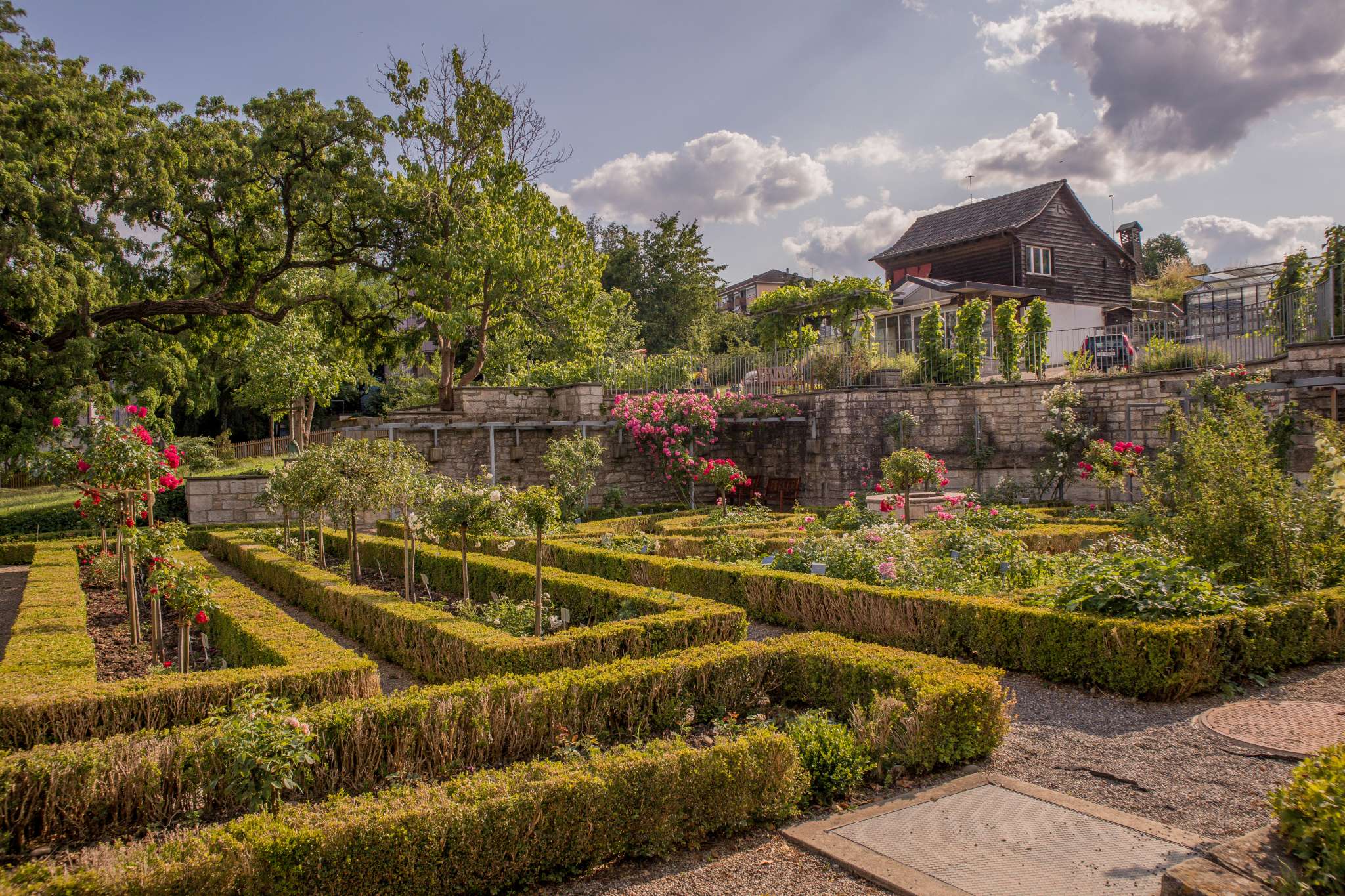 Der circa 300 Quadratmeter große Rosen- und Pfingstrosengarten wurde einst vom Schweizer „Rosenvater“ Dietrich Woessner als Stil- und Prüfgarten prächtig angelegt. Die Rosen wurden durch die Rosenfreunde Schaffhausen 2009 neu gepflanzt. Gleich unterhalb der Rosen wachsen seit 2014 über 90 verschiedene Pfingstrosensarten. Gleich beim Garteneingang wachsen Wildarten, aus denen zahlreichen Sorten gezüchtet wurden. Auch sind zehn Sorten zu sehen, die der 2006 verstorbene Engländer Sir Peter Smithers im Tessin gezüchtet hat.