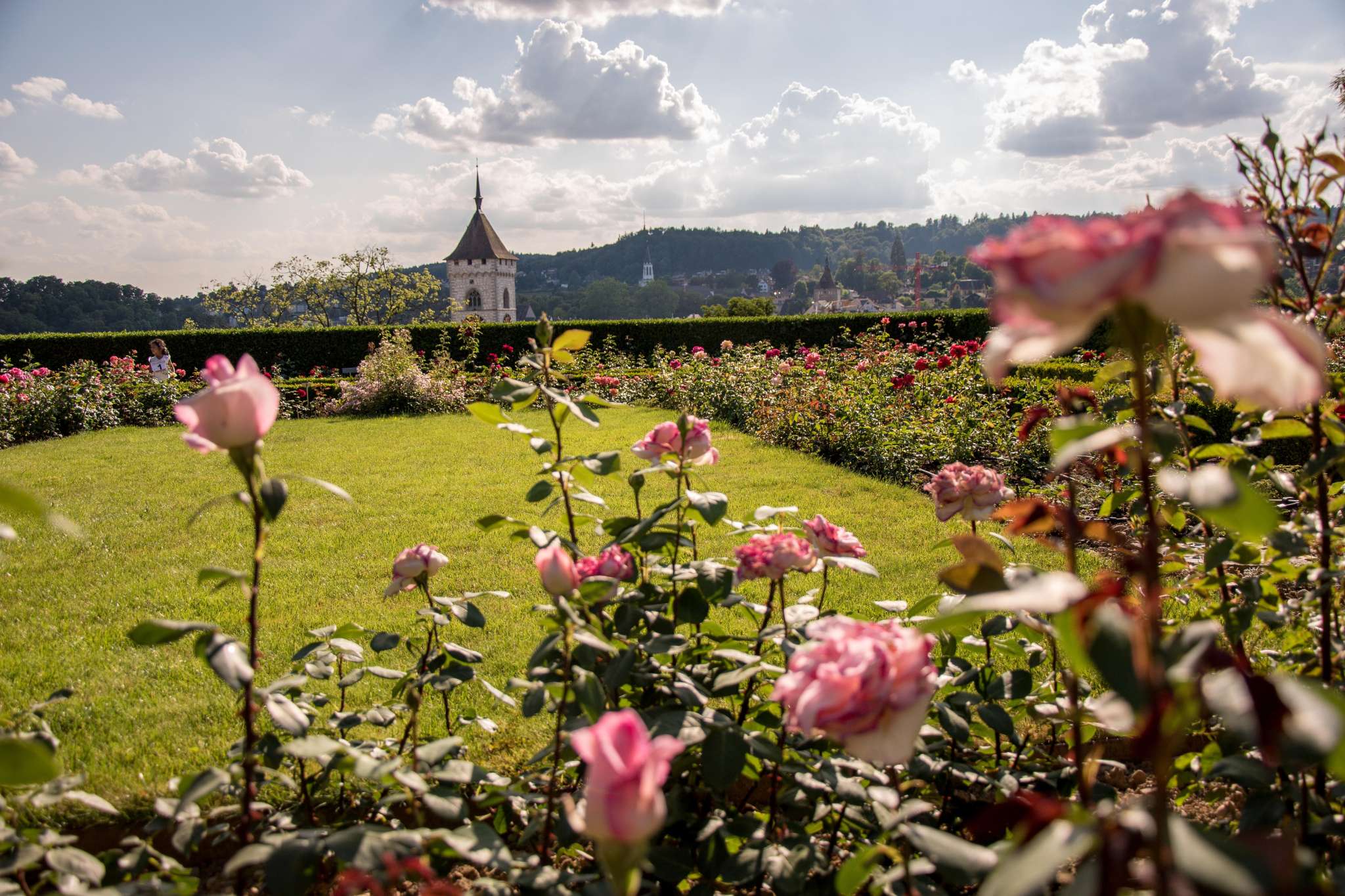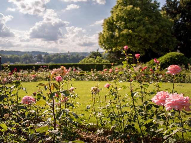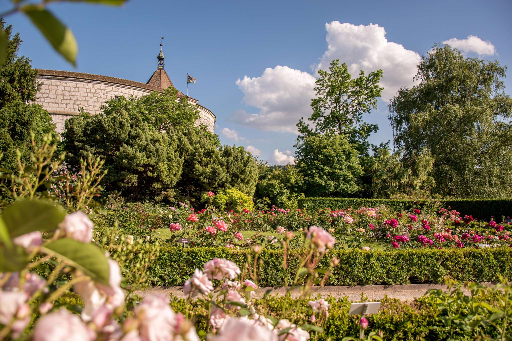 Der Rosengarten liegt direkt neben dem Munot. Der Garten umfasst einw Fläche von rund 2000 Quadratmetern und circa 170 Rosenarten.