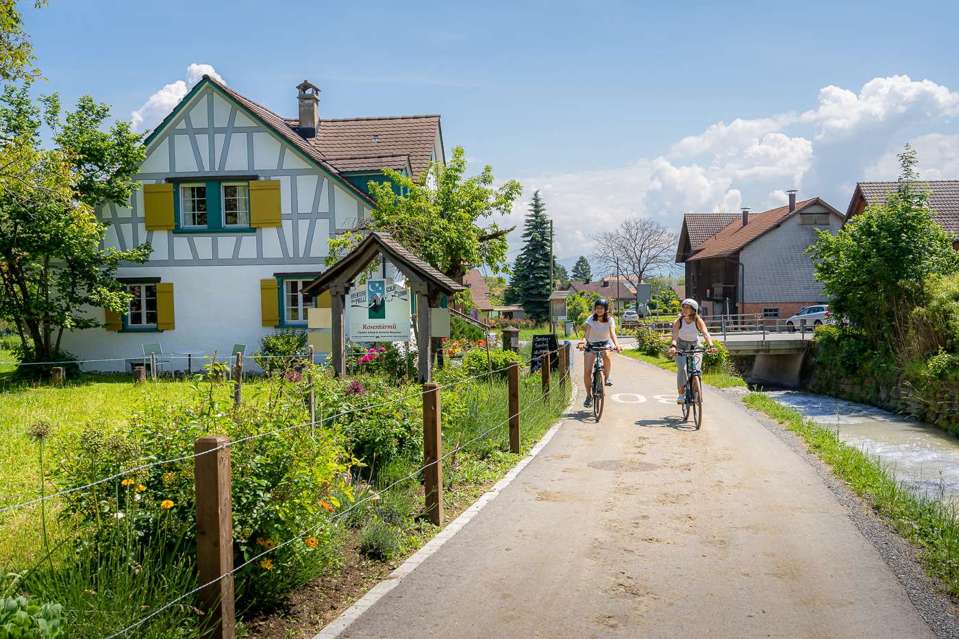 Der sehr gut erreichbare Hof «Rosentürmli» ist ein unter Heimatschutz stehender, renovierter Riegelbau mit Turm. Er befindet sich am Dorfrand von ThaI an klimatischer Vorzugslage am Fuss des grossen Rebbergs. Betrieben wird Milchwirtschaft, Obst- und Ackerbau und im Gewölbekeller lagert Wein aus eigenem Anbau. Kühe, Kälber, Pony, Pferd, Kaninchen, Hühner, Katzen und der Hofhund Böhnä beleben mit der sechsköpfigen Familie zusammen den Hof.