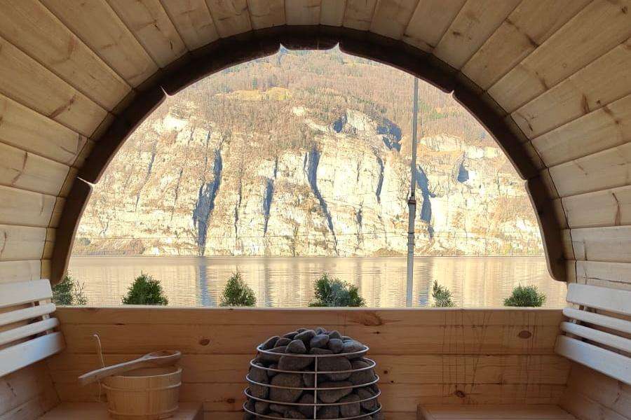Entspannung pur im Saunafass des Hotel Schiffahrt Mols – mit Panoramablick auf die Berge, privater Nutzung & nordischem Flair.
