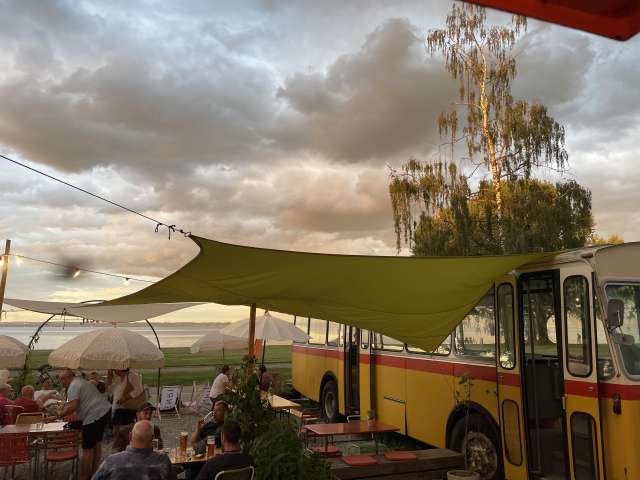 Die Mischung aus urbanem Ambiente des ehemaligen Industrieareals dahinter und der Arboner Seepromenade davor, machen den Saurer Garten zu einem Lieblingsplatz. Gäste erfreut ein breites und schönes Angebot an Getränken. Vom Morgenkaffee bis zum Apéro und erfrischenden Drinks ist hier alles zu haben. Daneben bietet der Foodtruck Feines zum Naschen. Für Kinder ist ein Sandkasten zum Spielen aufgestellt. Das Industriegebäude hinter dem Garten beherbergt das Saurer Museum. Dieses zeigt die eindrucksvolle Geschichte der Adolf Saurer AG, die lange Zeit bedeutendste Schweizer Herstellerin von Lastwagen und später auch von Textilmaschinen war. Produziert wurde unter anderem am Ort, der heute das Museum beherbergt. Ein Fahrzeug aus der Saurer Erfolgsgeschichte steht denn auch stimmungsvoll im Saurer Garten – ein umgebautes Postauto. Höhepunkt für Kinder: es darf auf dem Fahrersitz Platz genommen werden. Der alte Saurer Bus lässt sich für geschlossene Gesellschaften mieten oder bietet Platz für den Drink und die Apéroplatte bei zweifelhaftem Wetter. Events wie Kindergeburtstage, ein Fondueplausch oder eine private Musiksession werden gerne ausgerichtet.