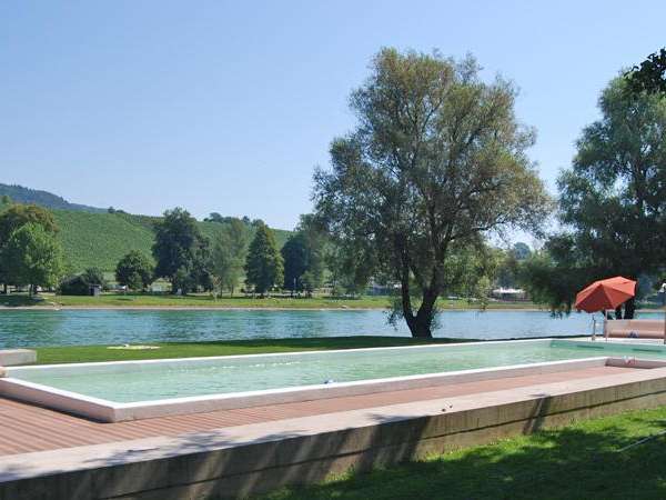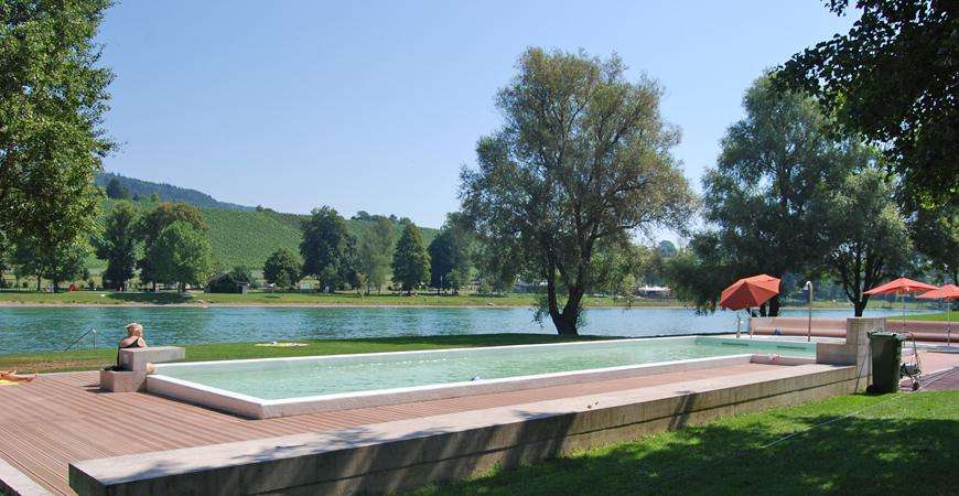 Am Ufer des Rheins geht man an einem kleinen Sand- und Kiesstrand ins Wasser. Und mit einer kleinen Sprunganlage, zwei gepflegten Becken für Kinder und Nichtschwimmer bietet das Strandbad den Besuchern vielfältigen Schwimm- und Badespass. Freizeitangebote wie ein Tischtennistisch, eine Feuerstelle und eine Kioskwirtschaft runden das Angebot ab.