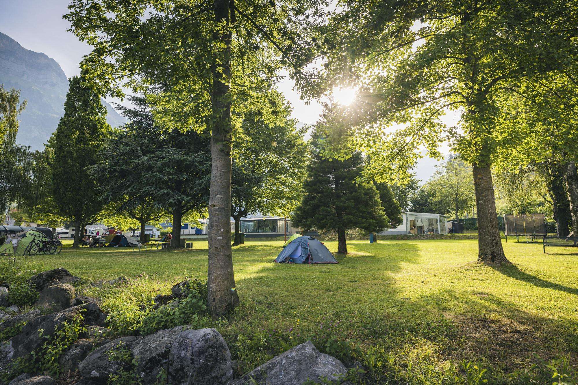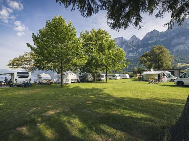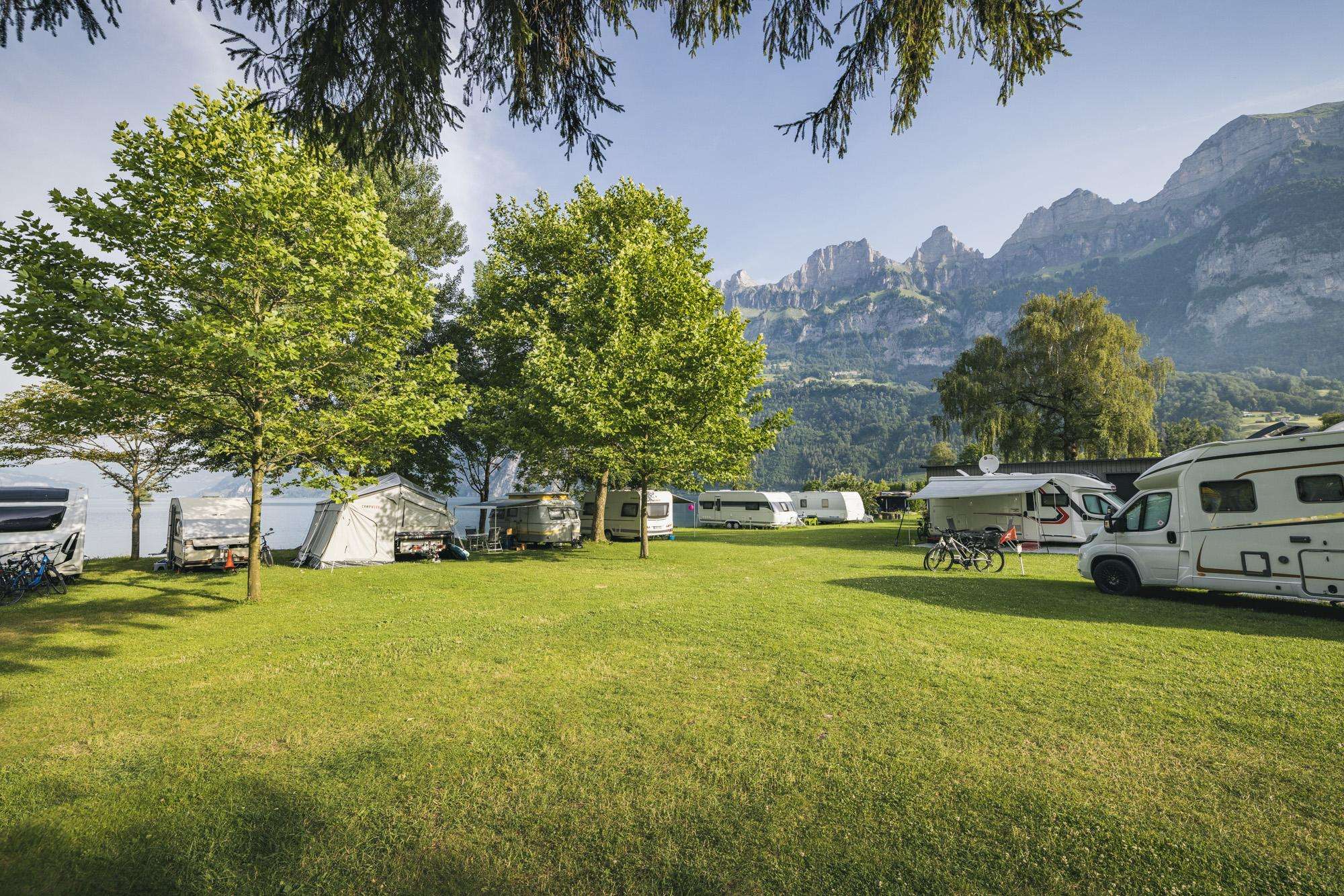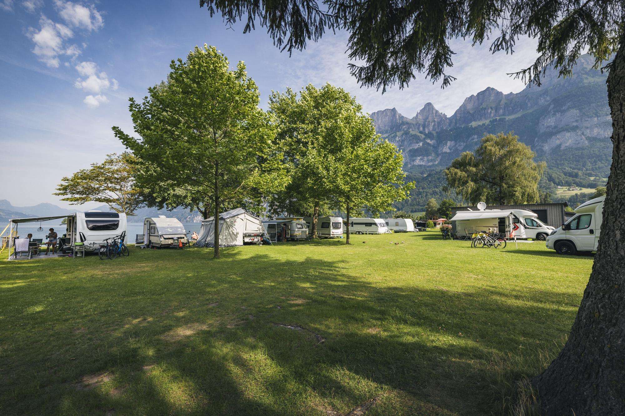 Ferienplatz für Zelte, Wohnwagen und Wohnmobile. Direkt am Ostufer des sauberen Walensees, ca. 1 km vom Garnisonsstädtchen Walenstadt entfernt. Ausgangspunkt für schöne Ausflüge mit Auto, Velo oder zu Fuss.