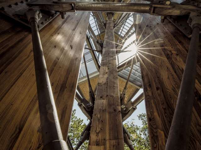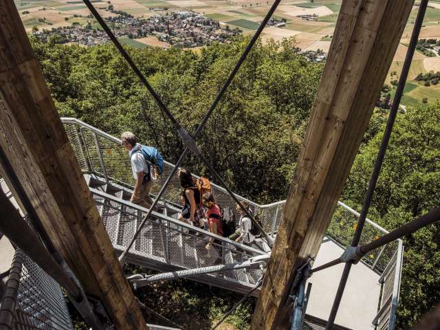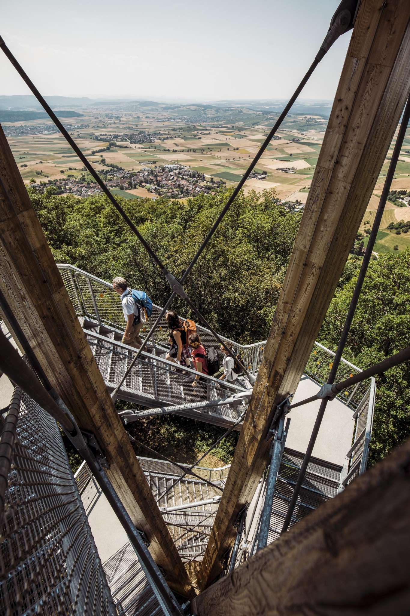 Auf der 19 m hohen Plattform öffnet sich den Besuchern eine aussergewöhnliches Panorama von den Vorarlbergeralpen, über die Ost- und Zentralschweizer Berge bis zu den Gipfeln des Berner Oberlandes und weiter bis zu den Schwarzwaldhöhen. Atemberaubend ist auch der ungehinderte Blick auf die liebliche Landschaft des Klettgau und die Wälder des Randens.