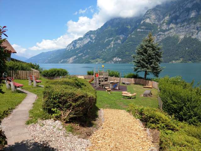 Das Spielerlebnis Walensee in Unterterzen bietet ein Abenteuer für Familien mit einem Themenspielplatz, der ein kleines Holzschiff, Balancierseile und eine Rutsche umfasst. Eltern können die Aussicht auf den Walensee geniessen.