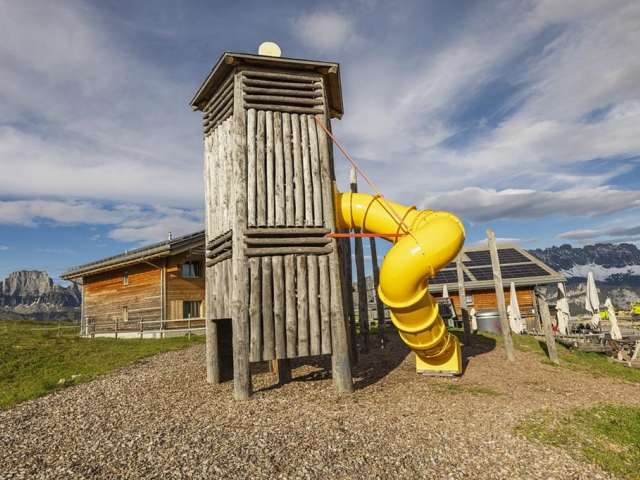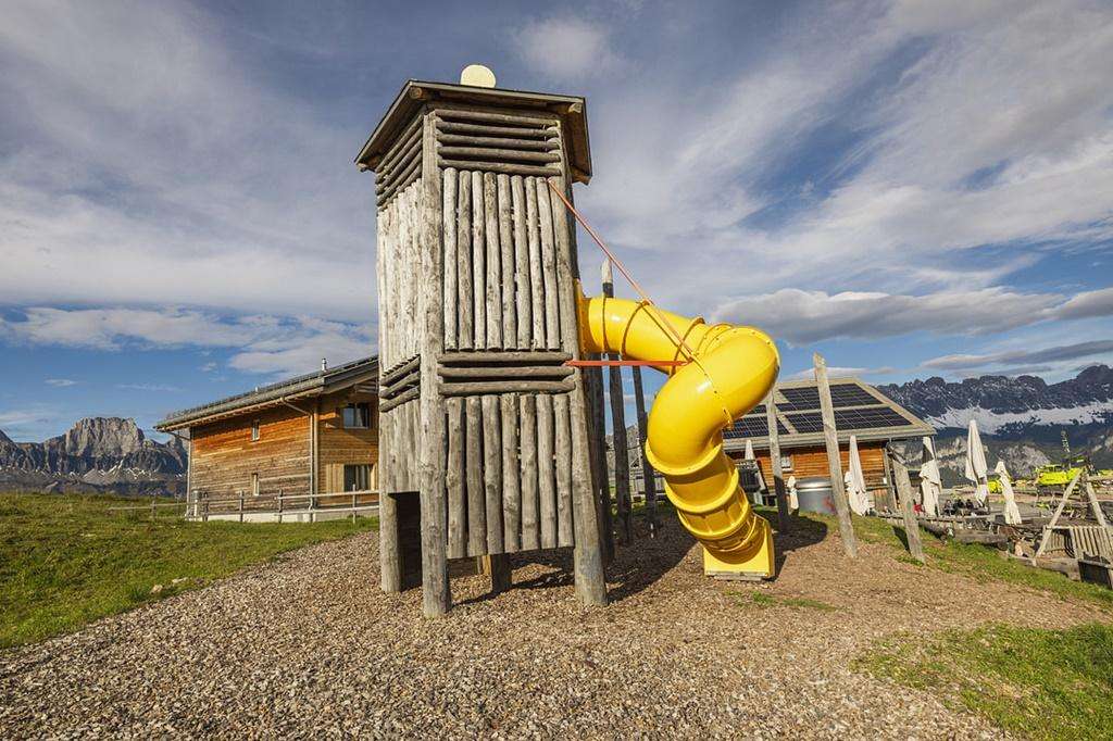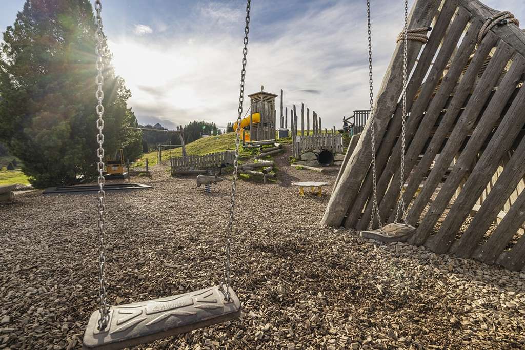 Der Spielplatz beim Restaurant Sennästube in Flumserberg Tannenboden bietet zahlreiche Aktivitäten für Kinder, darunter eine Zipline, ein Trampolin und eine Rundrutschbahn. Er liegt direkt neben der Restaurantterrasse und ist ideal für Familien.