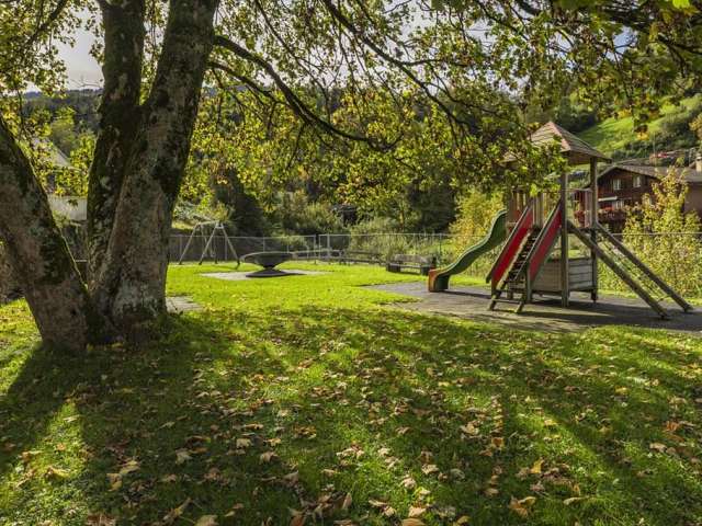 Ein Spielplatz mit einem Spielturm, der mit einer Rutschbahn und einpaar Kletterelementen ausgestattet ist. Zusätzlich gibt es zwei Schaukeln, die besonders für die grösseren Kinder geeignet sind und ihnen viel Spass beim Schwingen bieten.