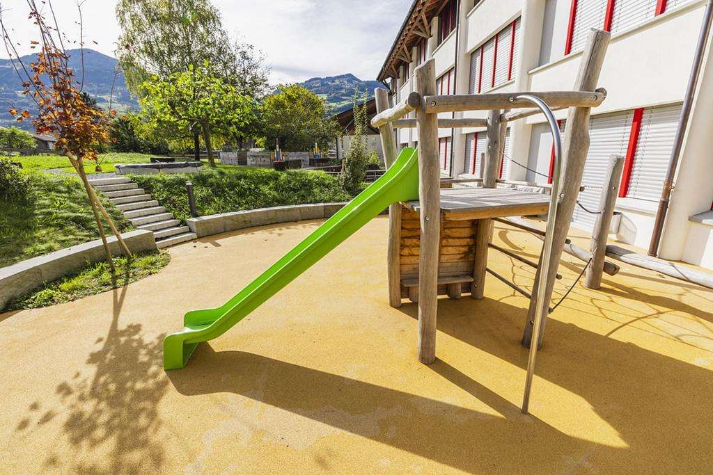 Der Spielplatz Camilu Schule Berschis bietet auf kleinem Raum Rutschbahn und Kletterelemente für jüngere Kinder. Ein idealer Ort für eine kurze, spassige Auszeit im Freien.