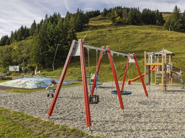 Der Spielplatz Pardiel Pizol in Bad Ragaz bietet eine Kleinkinderschaukel, einen Kletterturm und ein Hüpfkissen, ideal für die motorische Entwicklung und den Spielspass der Kleinsten.