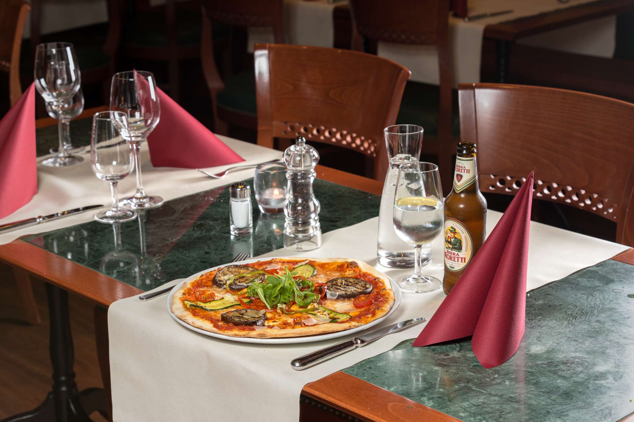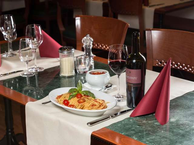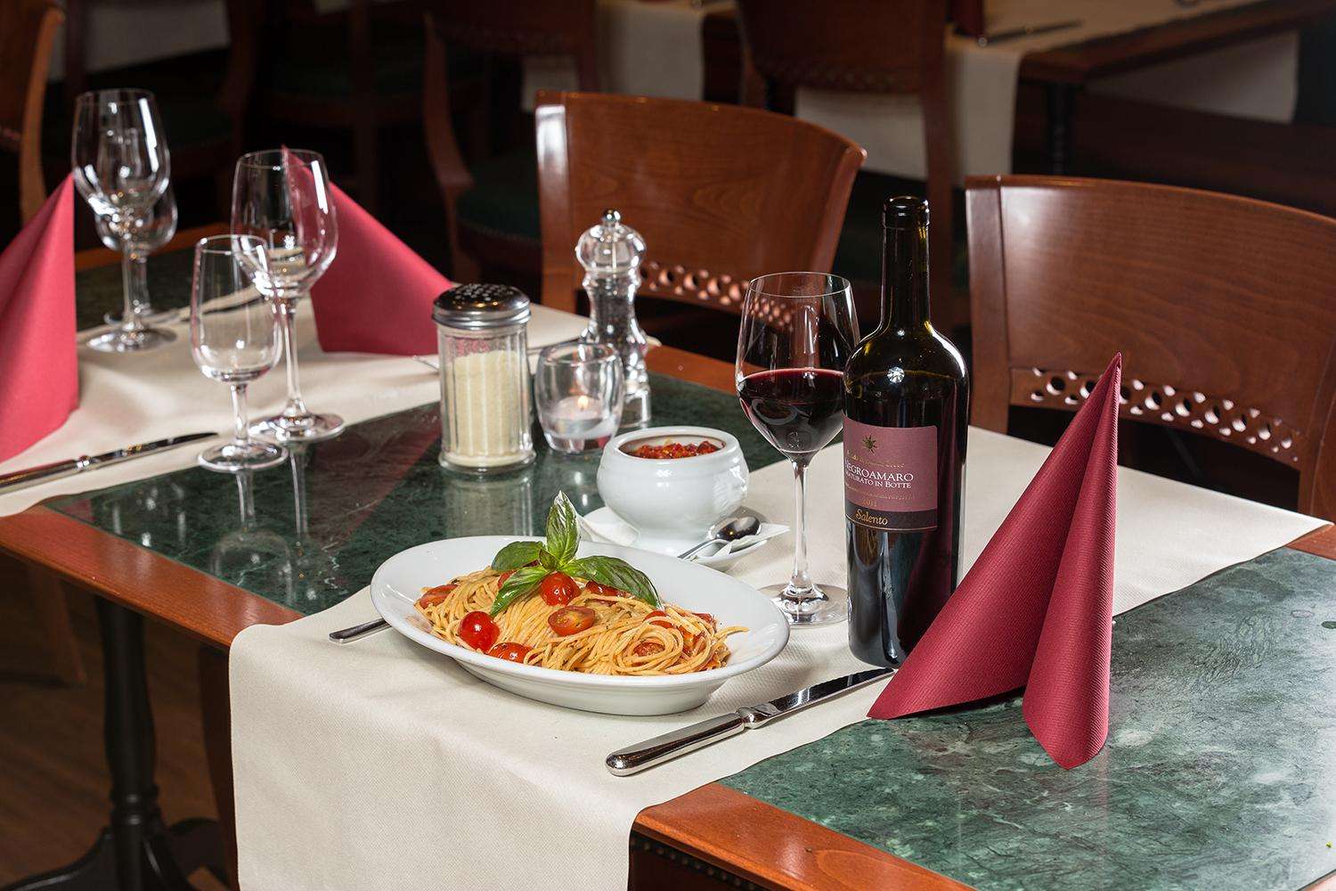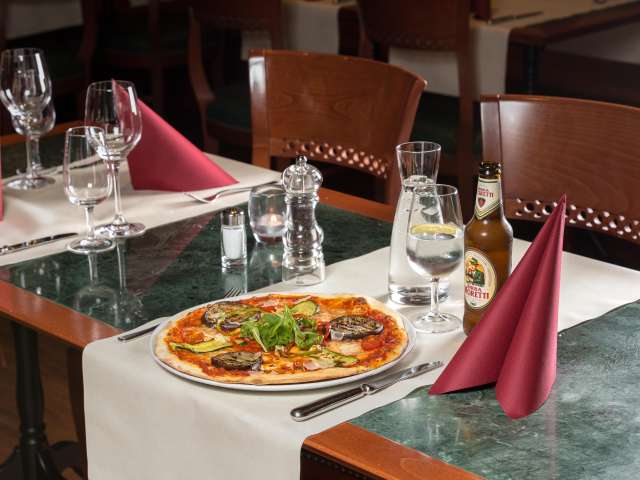 Saftige Steaks auf dem heissen Stein, knusprige, reich belegte Pizzas und die beliebten Pasta Gerichte werden mit Stil und lockerer Eleganz serviert.