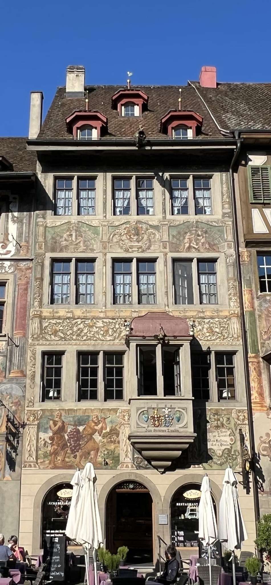 Repräsentatives Wohn- und Handelshaus aus dem frühen 17. Jahrhundert. Das Erdgeschoss war früher eine offene Halle. Viereckiger Steinerker von 1668. Dachuntersicht 1720 mit zwei schwerbeladenen Kaufmannsfuhren bemalt. Das Fassadenbild (Josua und Kaleb mit einer Traube aus dem Land, wo Milch und Honig fliessen) von C. Schmidt um 1900 ist eine Anspielung auf den Wohlstand des früheren Hausherren und den Hausnamen. Reichhaltige Stuckaturen im Innern.