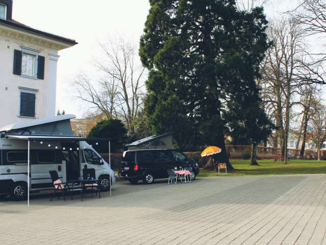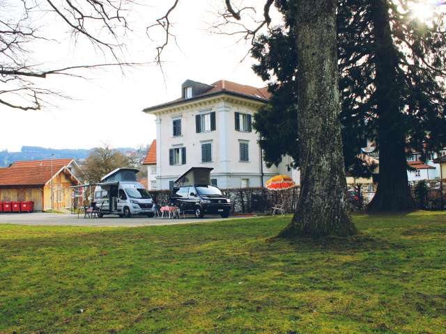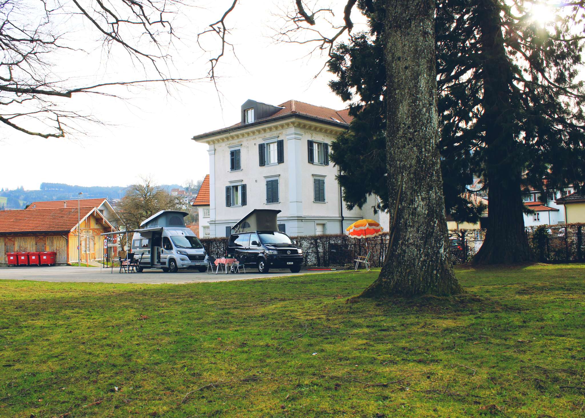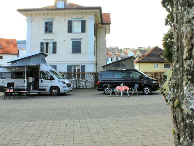 In maximal 700 Meter Gehdistanz entdecken Sie einige Einkaufsmöglichkeiten und Restaurants sowie den Bahnhof, Postautohaltestellen, Schwimmbad, Kino, Spielplatz und eine Abfalltrennstation. Der Platz ist ausreichend für zwei Camper mit Klappstuhlverhalten. Übernachten in Fahrzeugen ist nur mit eigenem WC erlaubt
