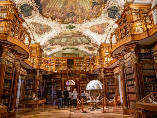 Der Barocksaal der Stiftsbibliothek überrascht durch seine reiche Rokoko-Ausstattung und gilt als einer der schönsten des Landes. Der Bestand der heute noch aktiven Bibliothek beträgt rund 170'000 Bücher. Die beeindruckende Sammlung frühmittelalterlicher Original-Handschriften macht diese Institution weltberühmt. Über 400 Bände sind mehr als 1'000 Jahre alt.