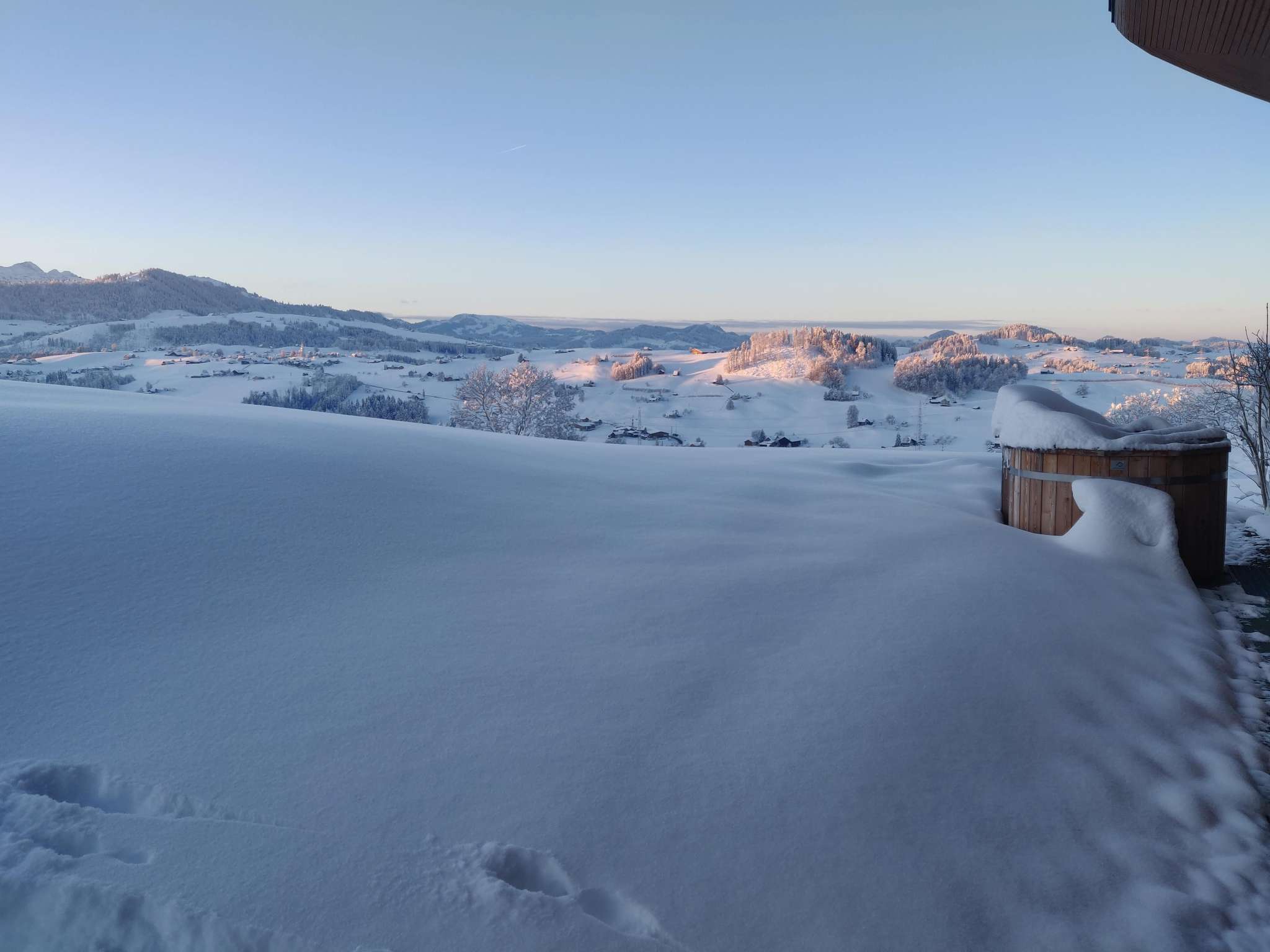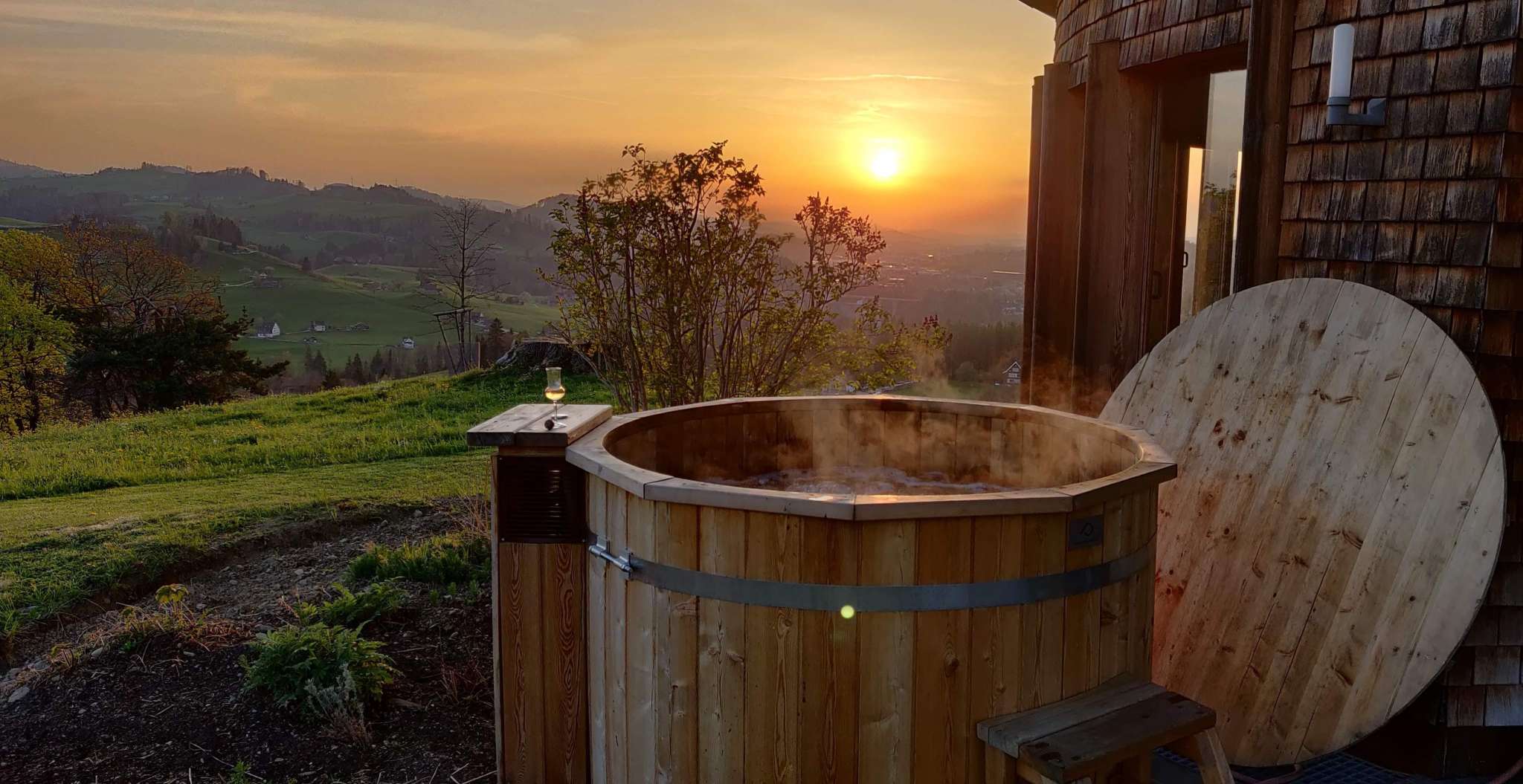 Ausspannen und sich Gutes tun – warum nicht Champagner im Hotpot? Geniessen Sie ein wohliges Sprudelvergnügen auf der Hügelkuppe mit freier Sicht auf den Alpstein.