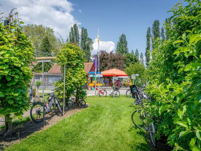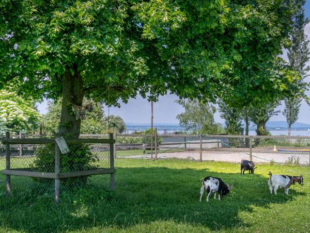Im grossen Garten mit vielen Obstbäumen gibt es einen vielfältigen Spielplatz und Tiere laden zum Verweilen ein. Hier können Wanderer und Velofahrerinnen vom Bodenseeweg verschnaufen, im Hofladen eine regionale Köstlichkeit einkaufen und den Alltag vergessen. In einem kunterbunten Durcheinander von Spielsachen tollen die kleinen Gäste herum und bauen Sandburgen. Blökende Ziegen lieben es gestreichelt zu werden und hoppelnde Hasen warten auf einen Löwenzahn aus Kinderhand.