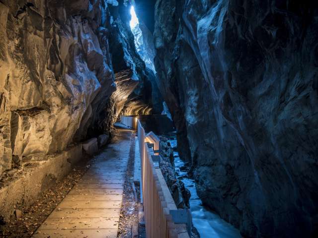 Die Taminaschlucht bei Bad Ragaz bietet einen 450 Meter langen, sicheren Weg zur Quellwasser-Grotte. Hier sprudeln 8000 Liter Thermalwasser pro Minute aus Europas ergiebigster Akratotherme mit einer konstanten Temperatur von 36,5 °C.