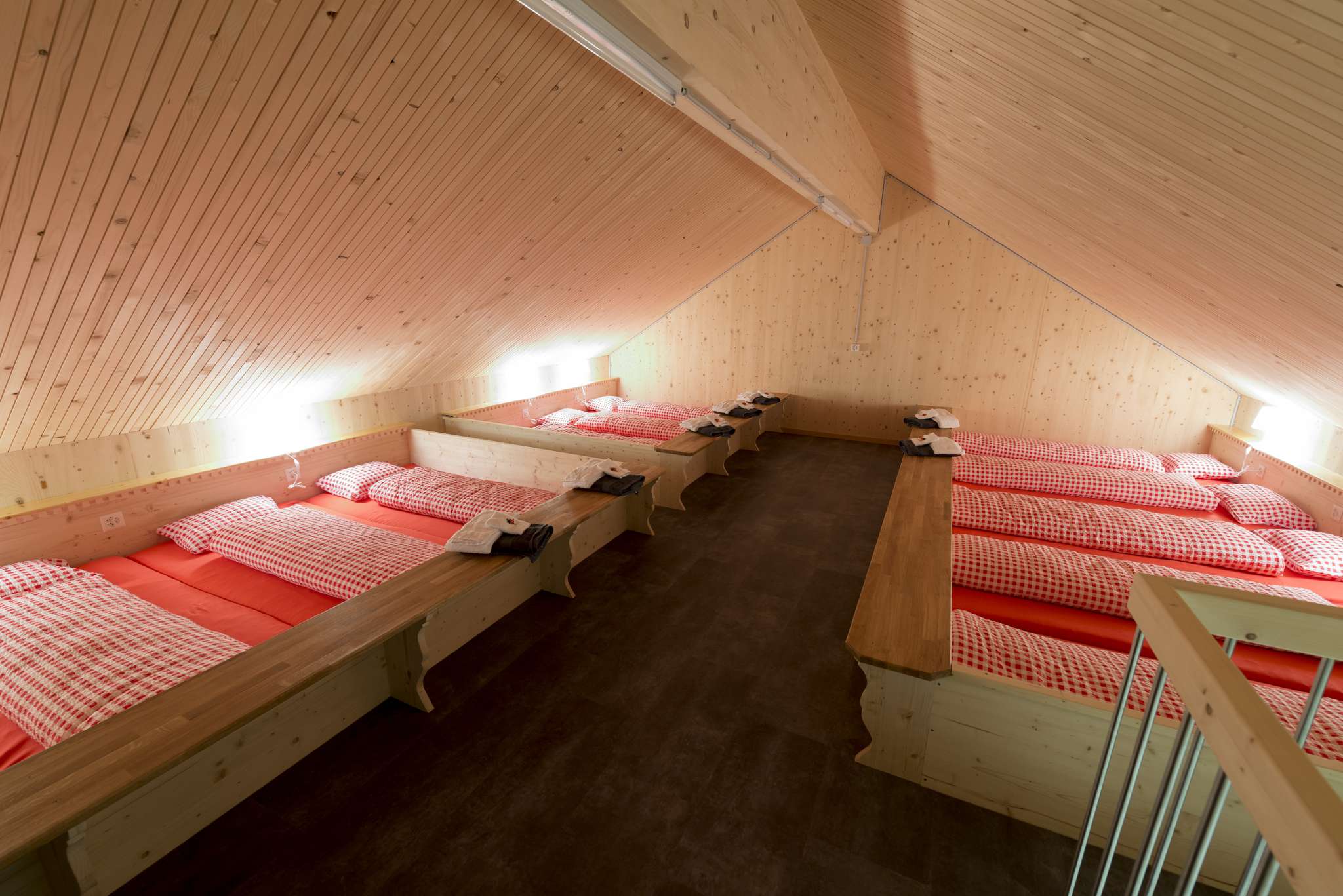 Das Matratzenlager bietet Platz für 12 Schlafplätze. Alle Betten sind mit Duvet bezogen. Im Parterre befindet sich eine Dusche mit WC. Zusätzlich steht für die Gäste ein Kühlschrank mit einer kleinen Auswahl an Getränken zur Verfügung. Ein traditionelles Holzbuffet und eine Sitzecke mit Tisch runden die heimelige Unterkunft ab.