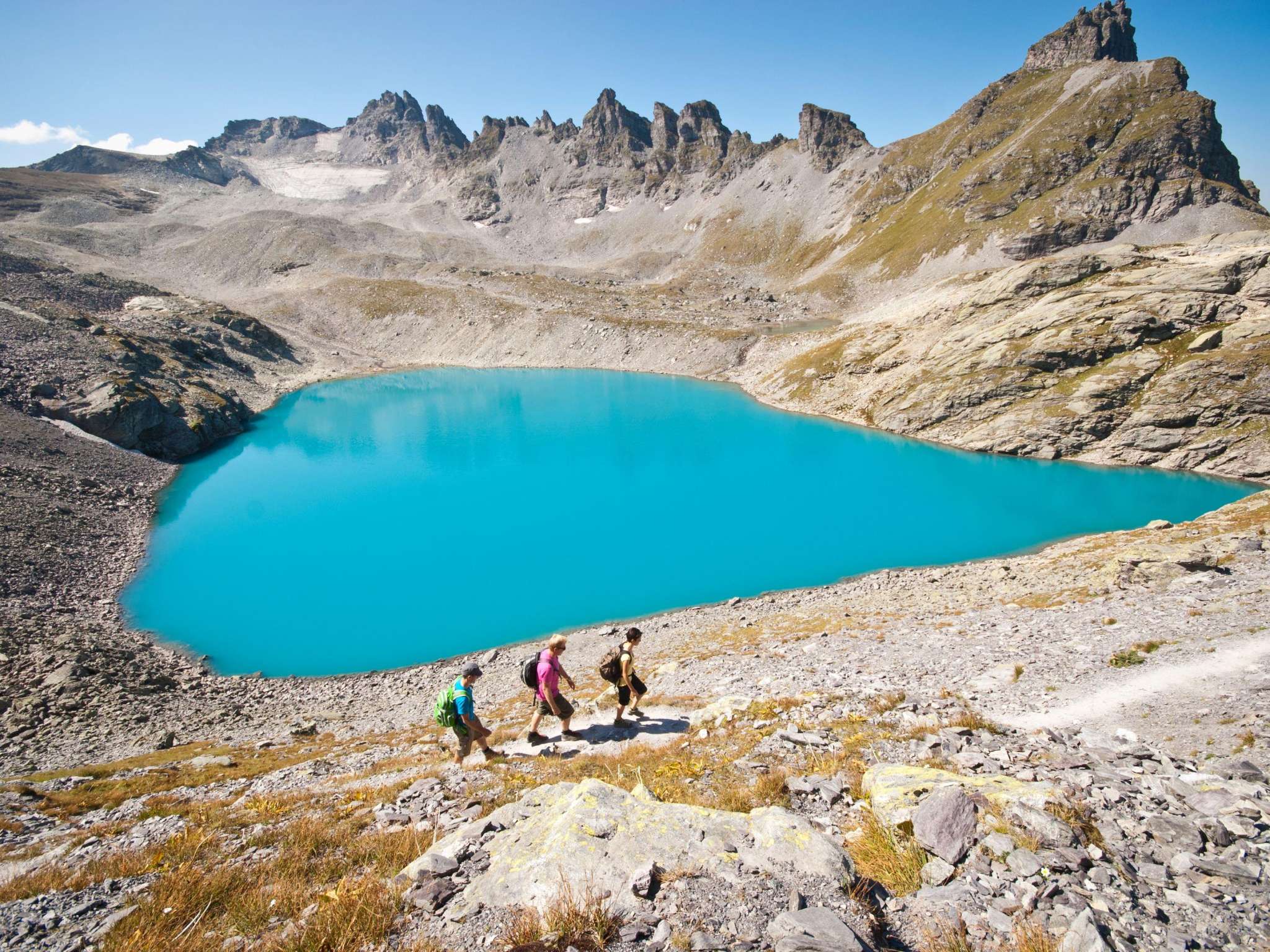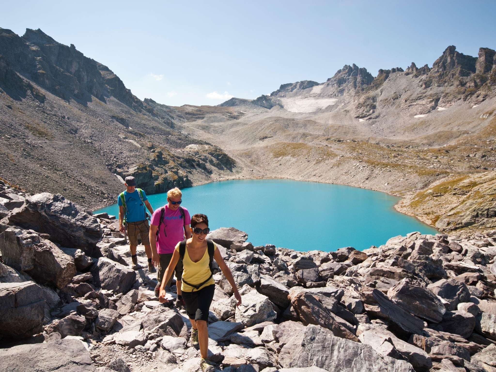 Ob Wildsee, Schottensee, Wangsersee, Schwarzsee oder Baschalvasee: Jeder der fünf Pizolseen ist ein Bijou für sich und so unterschiedlich, dass der Betrachter aus dem Staunen nicht mehr herauskommt. Als Wanderklassiker in der Schweiz gilt die 5-Seen-Wanderung, bei der man an allen Pizolseen verbeikommt. Die Wanderung beginnt bei der Pizolhütte am Wangsersee. Der Aufstieg zur Wildseelücke auf 2'493 m, von wo man eine schöne Aussicht bis zum Ortler und Piz Kesch hat, dauert rund eine Stunde. Unterhalb der Scharte auf 2'438 m liegt der Wildsee, mit seinem milchig-blauen Wasser und wirkt fast wie hineingemalt in die unwirtlich-karge Alpinlandschaft. Im Hintergrund entdeckt man Pizolgletscher, den Pizolgipfel und die Grauen Hörner. Nach einem kurzen Abstieg gelangt man zum grünlich schimmernden Schottensee auf 2'335 m, dessen klares Wasser ganz Hartgesottene an einem schönen Sommertag ab und an sogar zu einem Bade animiert. Weiter geht es zum Schwarzsee 2'368 m, der im Gegensatz zu den ersten beiden Seen eher dunkel und bedrohlich wirkt. Kein Wunder, soll hier der Legende nach ein Stier im Wasser hause. An zahlreichen alten Steinmannli vorbei gelangt man schliesslich zum Baschalvasee auf 2'174 m, dessen Farbe mit dem Grün der umliegenden Matten konkurriert.