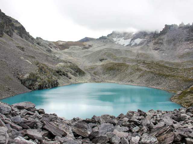 Der Wildsee, Teil der 5-Seen-Wanderung, liegt in einer hochalpinen Landschaft und beeindruckt mit seiner milchig-blauen Farbe. Die Wanderung bietet Ausblicke auf den Pizolgletscher und die Grauen Hörner.