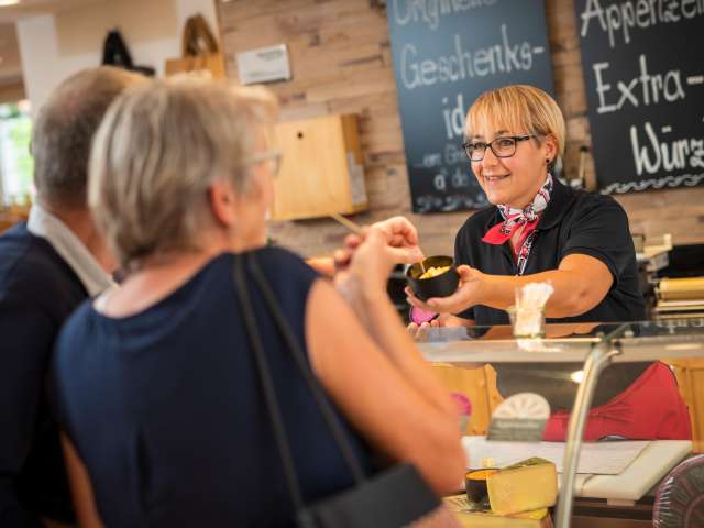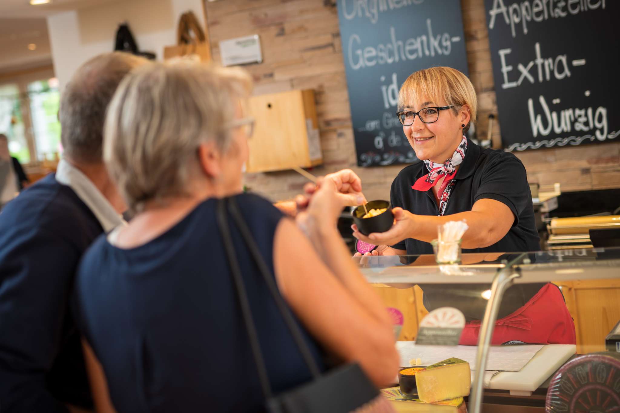 Over 80 different types of cheese are presented at an open counter in the speciality shop of the Appenzeller demonstration cheese dairy. Discover the huge variety on offer and find your personal favourite from the entire Appenzeller® range. You’ll also find perfect gifts for your loved ones or business partners in this shop!