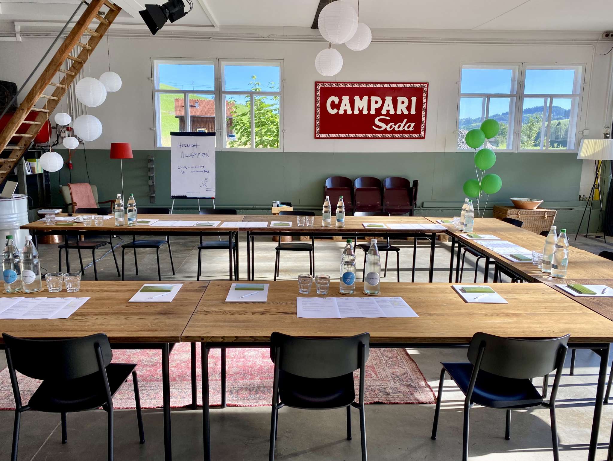 The Auenland is perfect for meet-ups, shared experiences and gatherings in the hills of the Appenzell region. Take some time out for yourselves in a private setting, where 50s industrial charm meets the great outdoors, and light-flooded factory halls with sweeping views await. The rooms can be interconnected and opened up. The property also boasts spacious grounds with natural landscaping. Ideal for seminars, meetings, celebrations and cultural events.