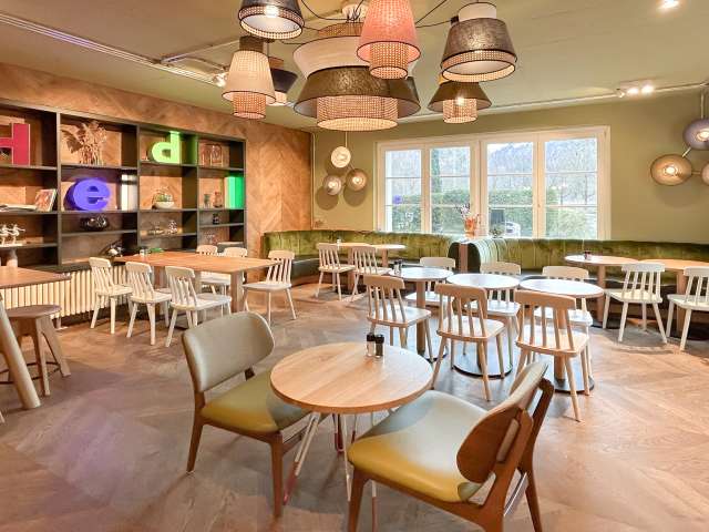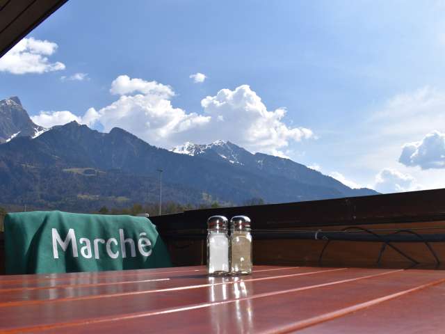 The motorway service area Marché Heidiland in Maienfeld offers market-fresh cuisine and numerous amenities such as a playroom, outdoor playground, and goat enclosure. Ideal for families, couples, and groups looking for a break on the A13.