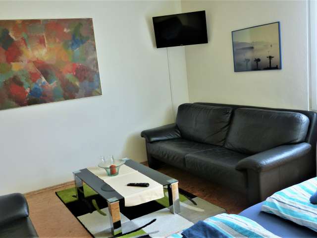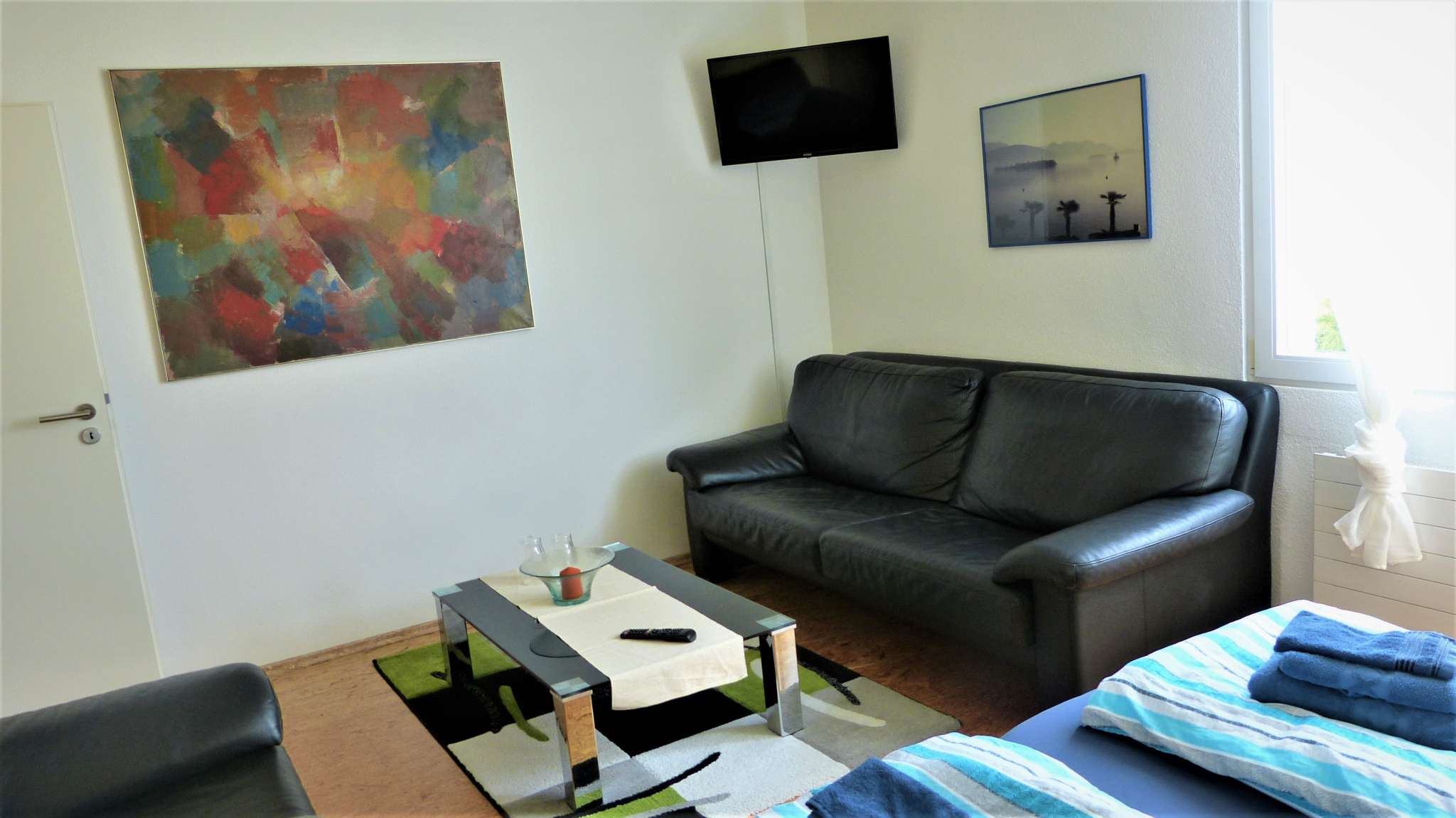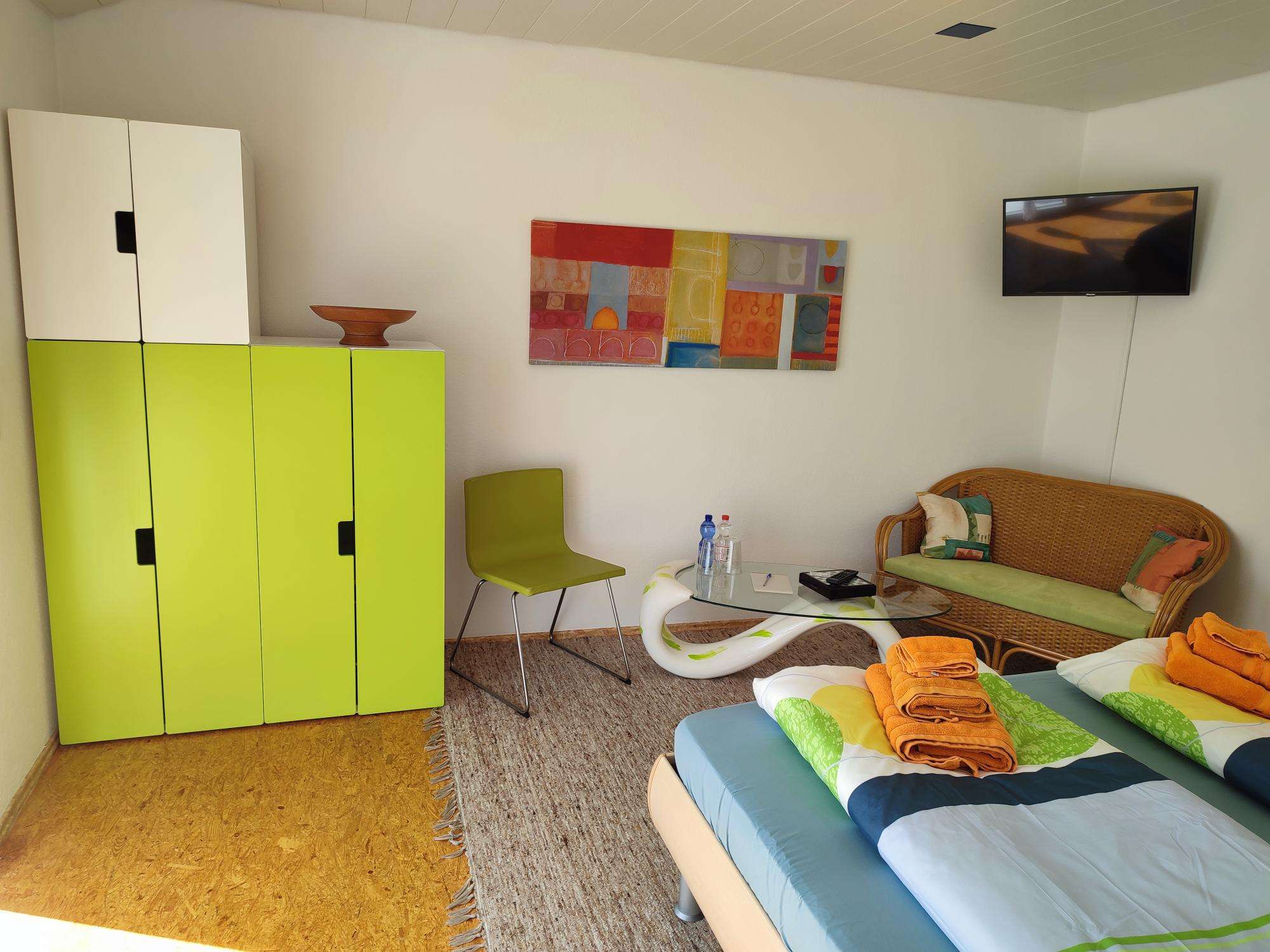 Four modern, large double rooms are equipped with king-size beds (all 180 cm wide), wardrobe, a small seating area and TV. All rooms have insect screens and blackout blinds. WLAN is available free of charge. The two bathrooms, 1x with rain shower/WC and 1x with bathtub/rain shower/WC, are shared.