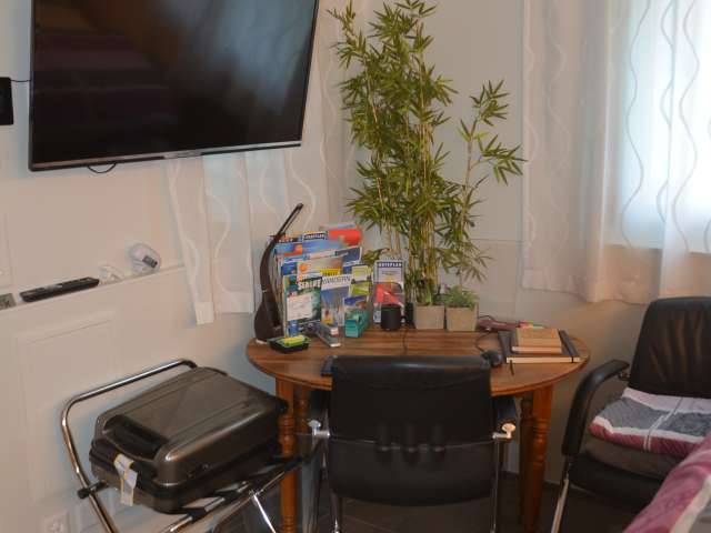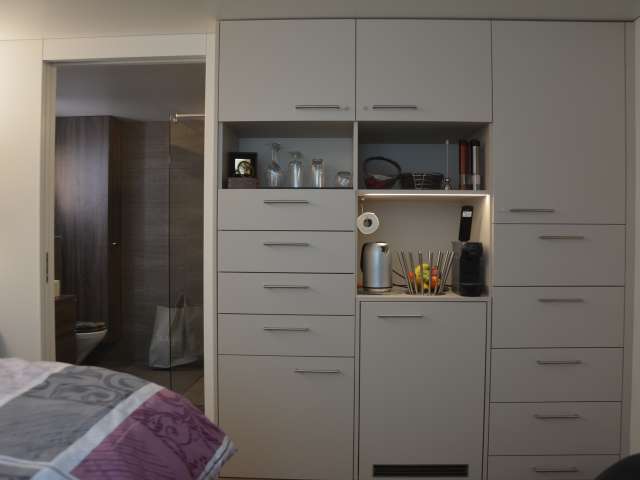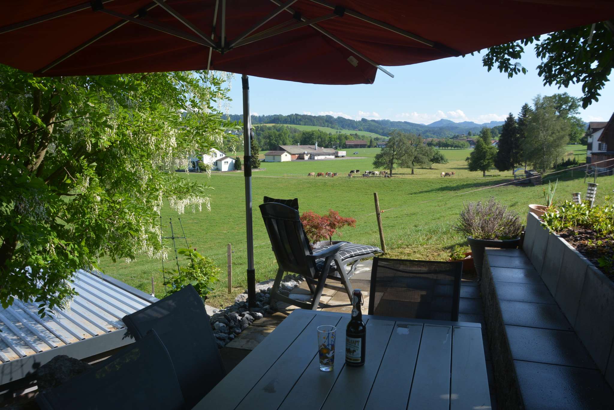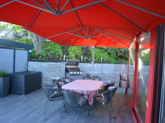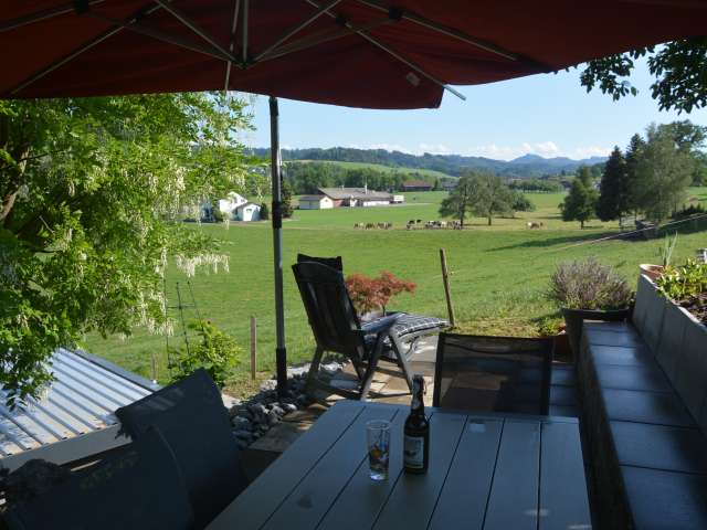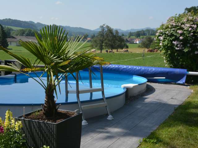 This modern studio is located in southern Thurgau, in the Wil region near St. Gallen. It delights with comfortable furnishings. A separate entrance, seating area and large-screen TV are available. Tense backs are pampered by a whirlpool, box-spring bed, massage chair and massage shower. The studio is also equipped for home office work and has the latest electronic equipment. In summer, you can make yourself comfortable on the sunny terrace. Working is also possible here. A heated pool invites you to swim. Coffee machine, tea maker and a refrigerator are available. Various snacks or drinks can be obtained for a fee, with non-alcoholic ones on the house. In addition to breakfast, lunch or dinner is available on request. The barbecue and dining table can be shared. Despite the quiet location on the outskirts of Sirnach, the distance to public transport is short. By car, you can reach Wil, St. Gallen or Zurich airport within 10 to 30 minutes.