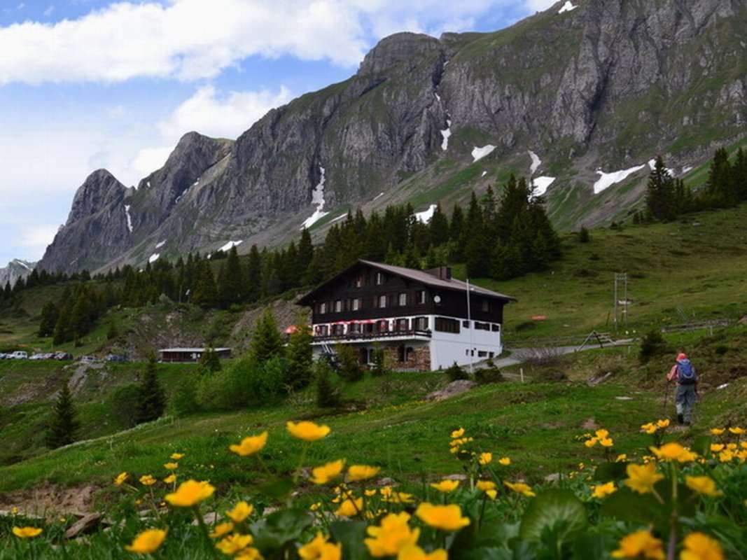 The mountain inn Palfries at 1700 m above sea level offers an impressive view of the surrounding mountain peaks Gonzen, Tschuggen, Gauschla, and Alvier. Open from June to October, it invites you to linger amidst the Alpine flora.