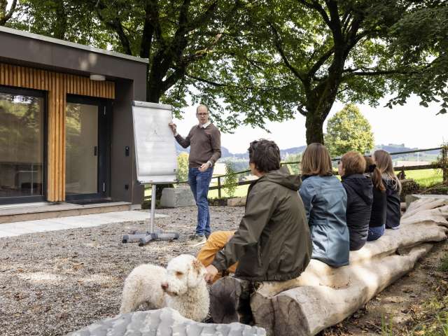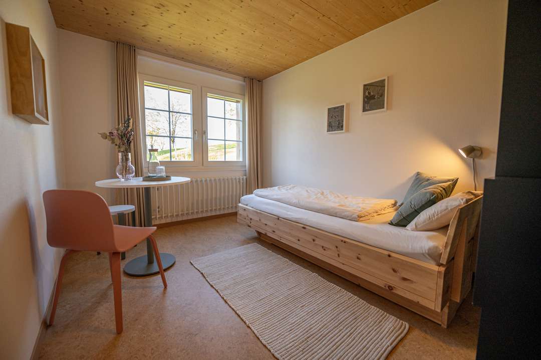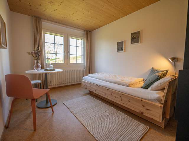 Choose from spacious meeting rooms with modern technical equipment, the devotional house, open-air workspaces and the pavilion and find the rooms that best suit your needs. Our seminar packages include room hire, coffee and croissants, a delicious two-course lunch and admission to our interactive exhibition. We also offer overnight stays in an original Appenzell house. In the newly renovated Haus Butendiek, which can accommodate up to 22 people, you can expect modern single and double rooms with high-quality SAMINA sleeping systems to ensure a restful night's sleep. Whether as a seminar guest, for a club weekend or a family celebration - here you can start the day with a view and a sense of well-being.