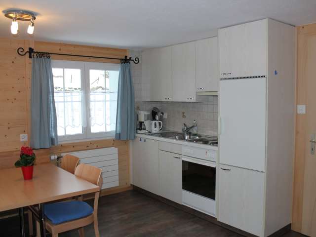 Both apartments have a kitchen with large dining table, corner bench and chairs. The kitchen is equipped with stove, oven, fridge, coffee machine, toaster and raclette grill. Bathroom with shower/toilet.