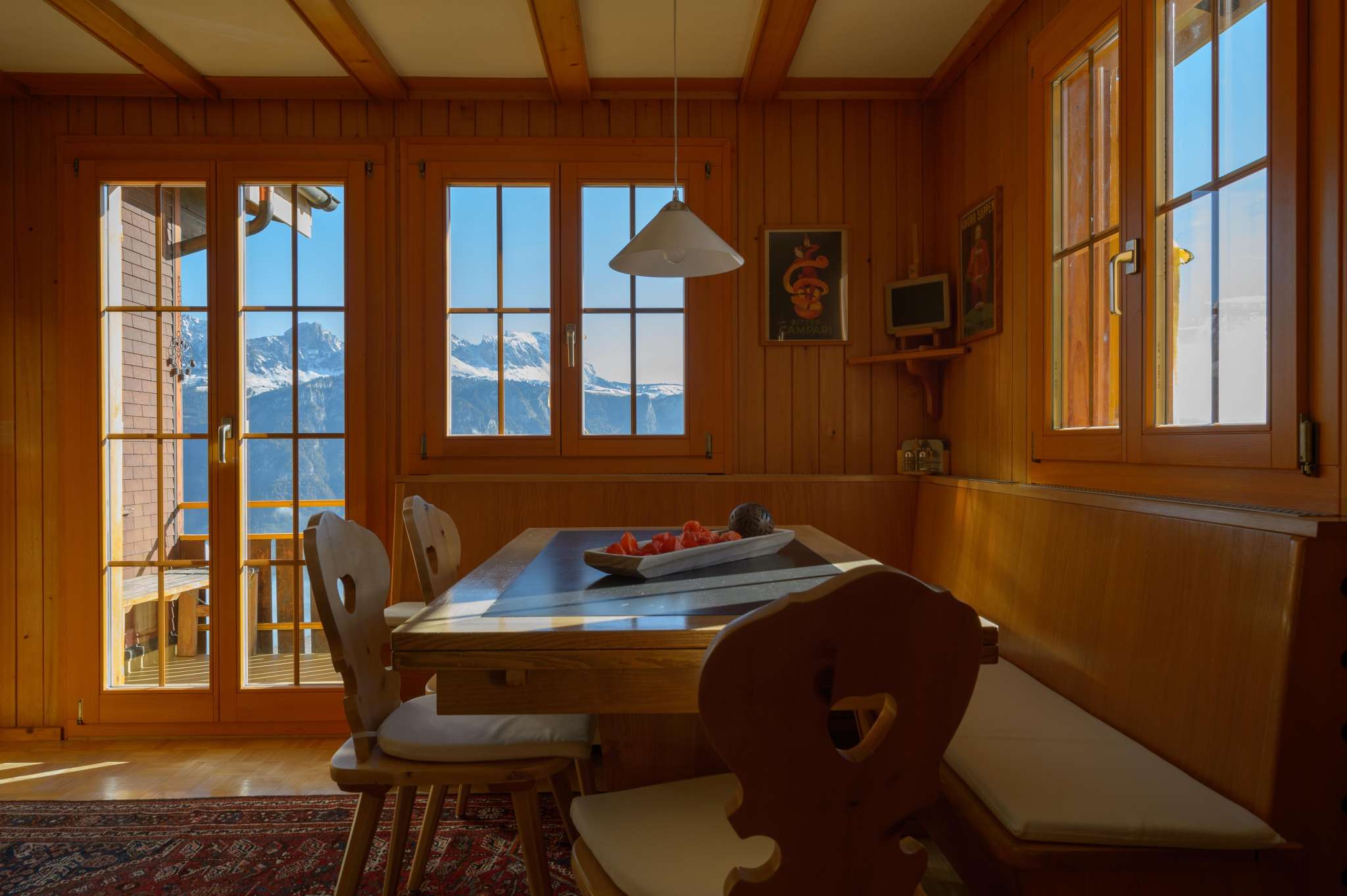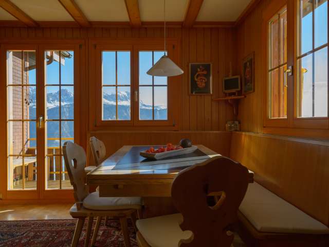 The detached 4.5-room chalet is in a quiet location in Flumserberg Tannenheim with an unobstructed panoramic view of Alvierkette, Sarganserland to the Austrian Alps and Bündner Herrschaft. The valley station of the cable car is only about 700m away. The chalet has a free car parking space.