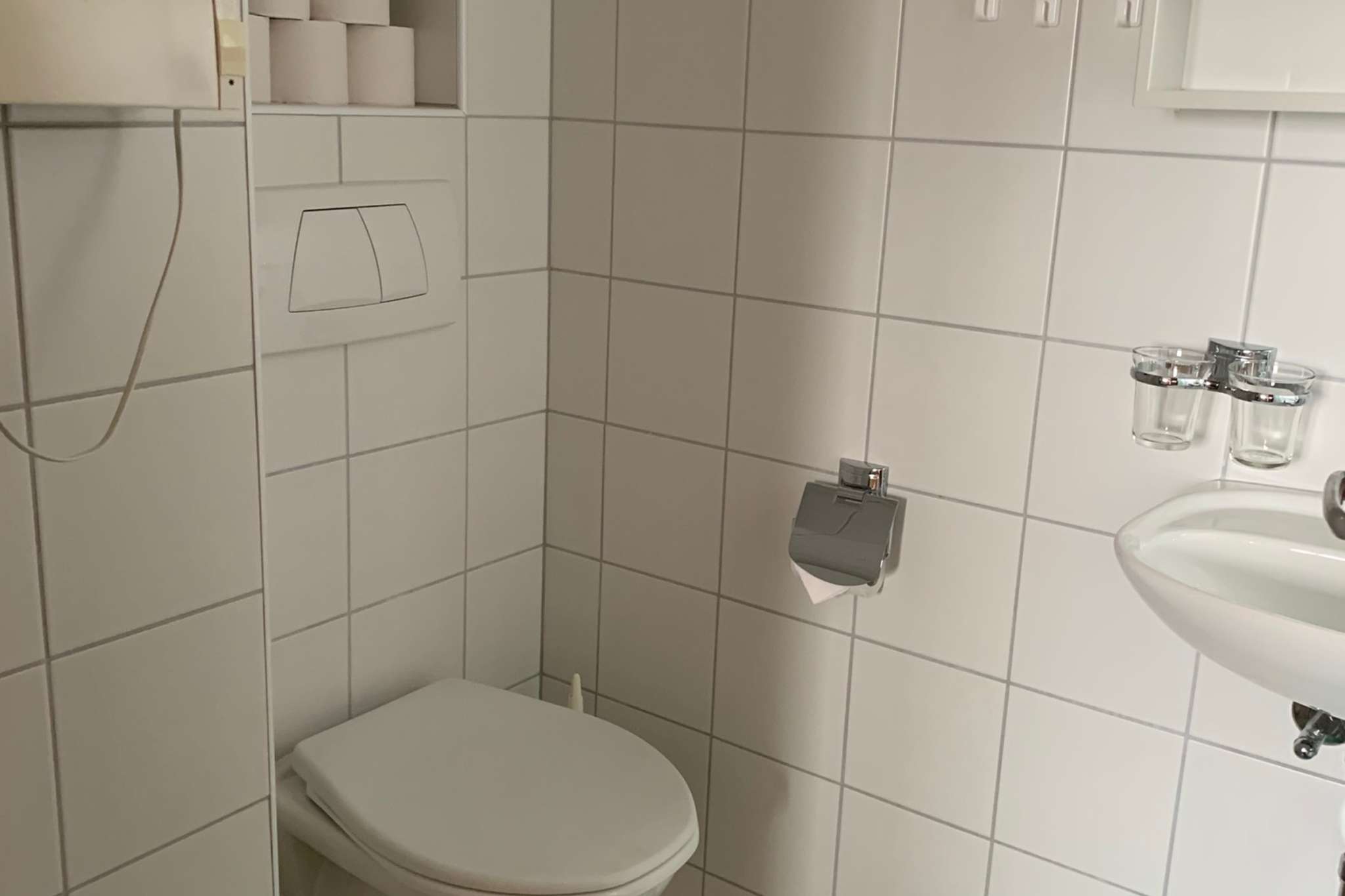 The 3-room apartment is functionally furnished and has a living area with sofa and cooking facilities. Bathroom with shower and toilet.