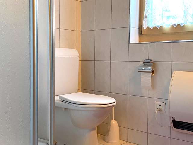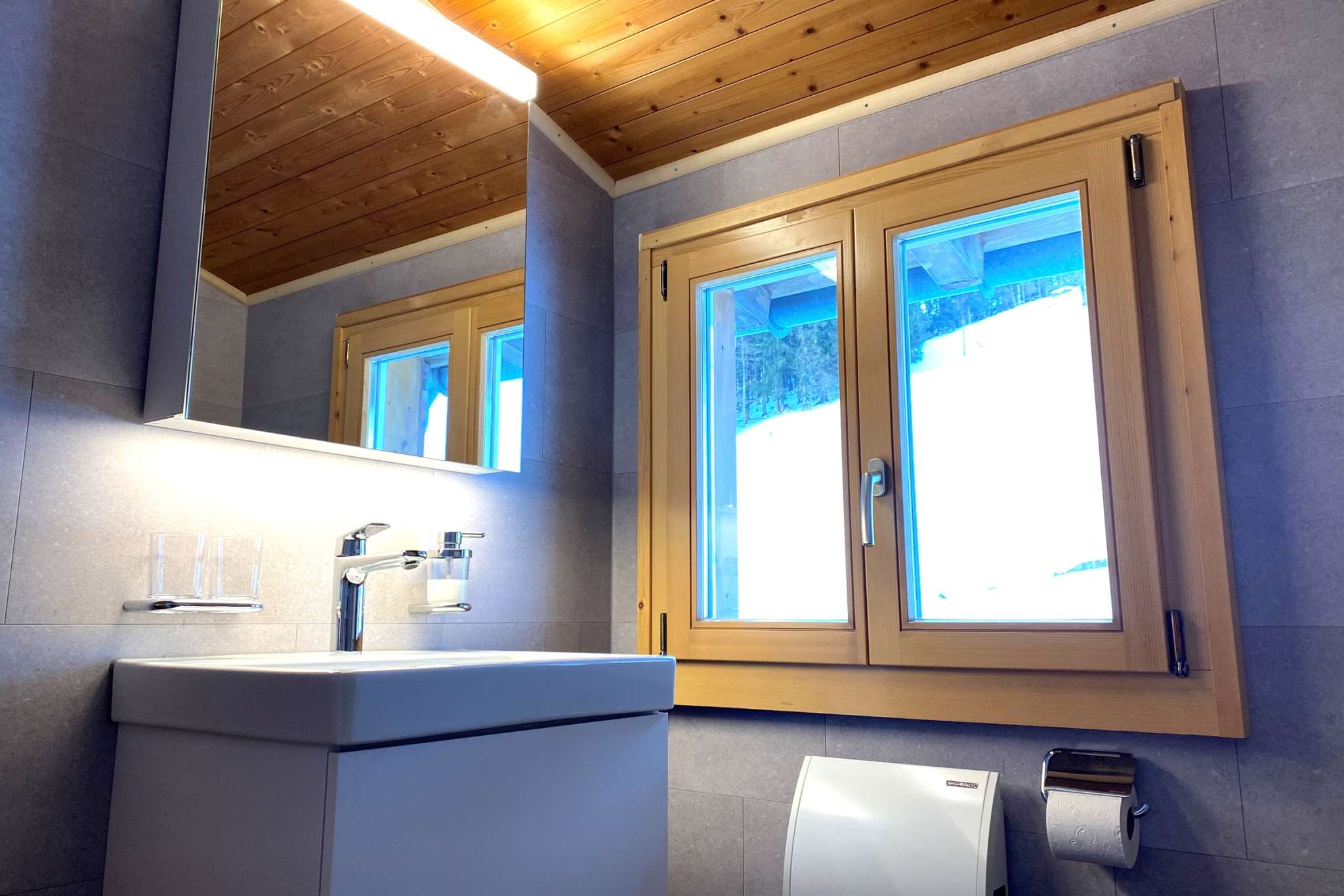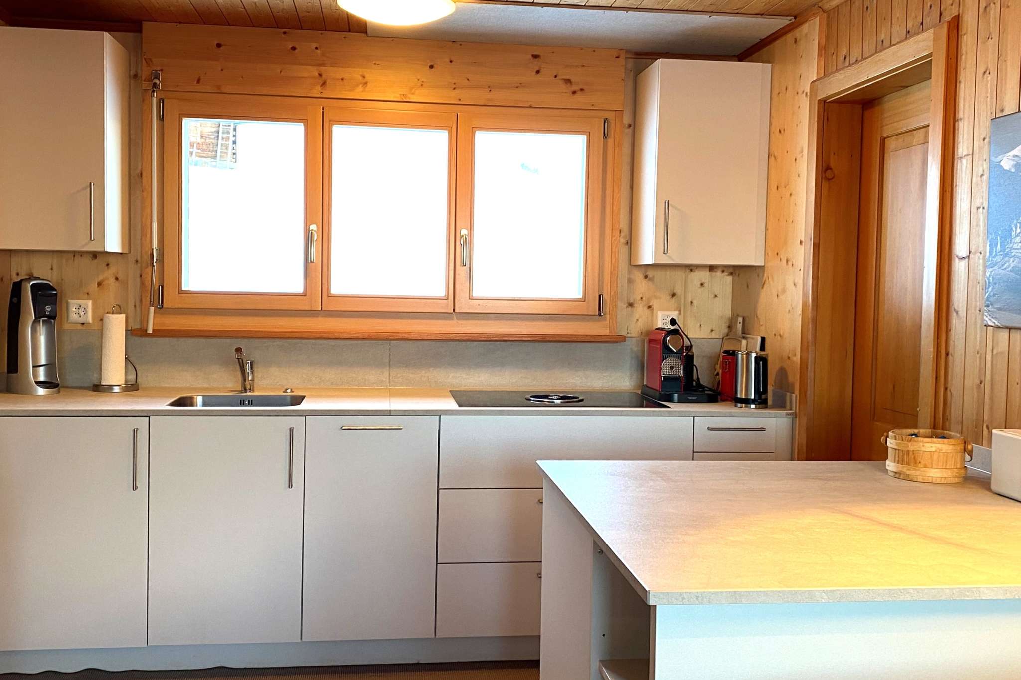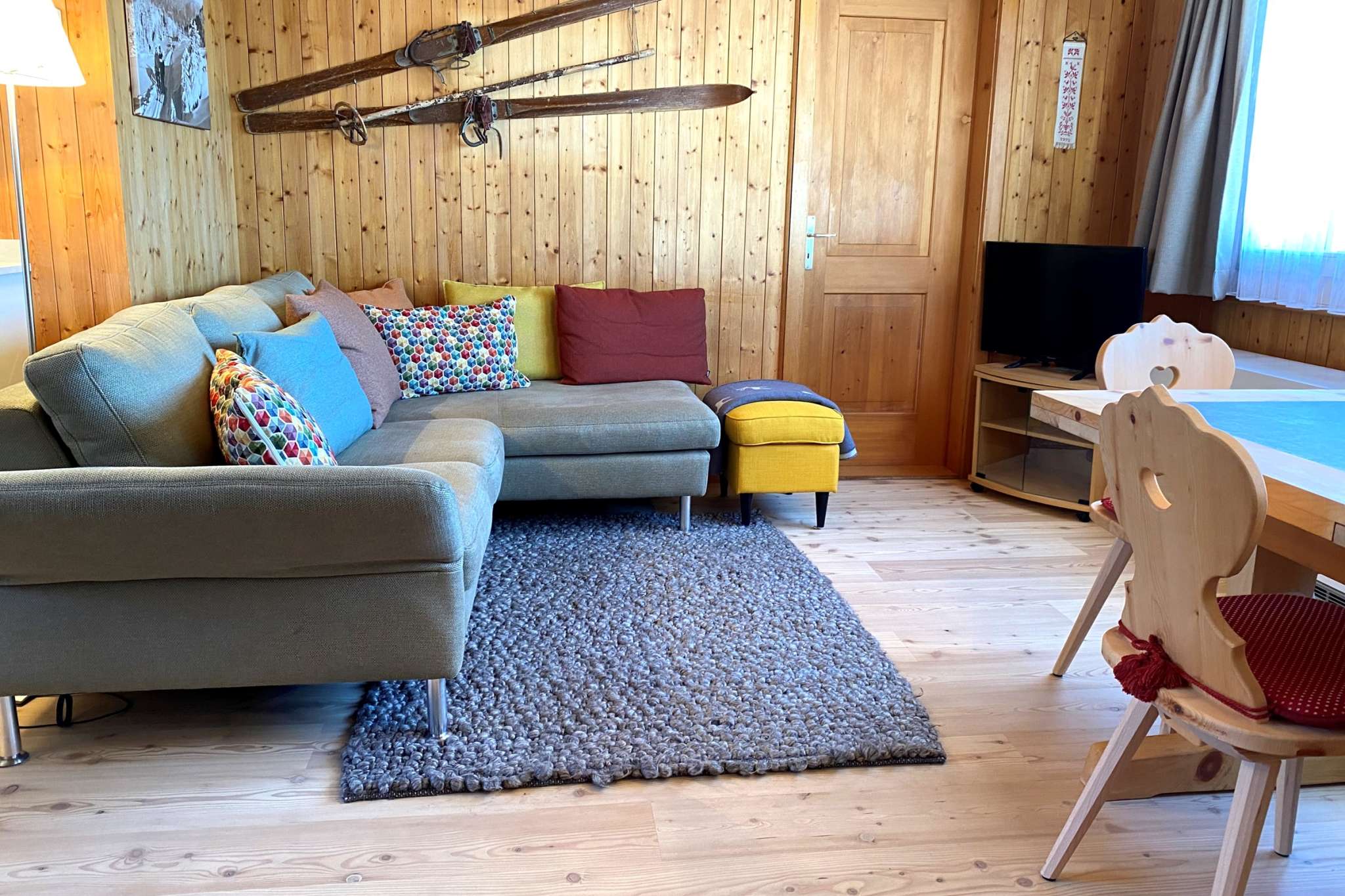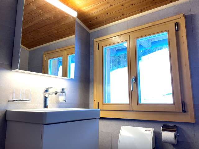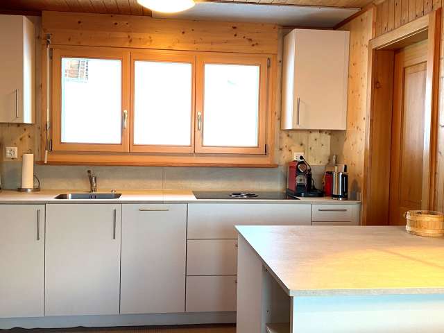 Well-maintained, detached chalet with a magnificent view. The chalet has 4.5 rooms. Two rooms with two single beds and wardrobe on the upper floor and one large room with double bed, wardrobe, sitting area and desk on the first floor. Living room with sitting area, TV and dining area. Two wet rooms with showers and a fully equipped open kitchen. Covered terrace and sitting area. Washing machine and storage room on the first floor. Parking spaces directly on the mountain road. The house is 50 m above the road. Ideal for families up to max. 5 persons.